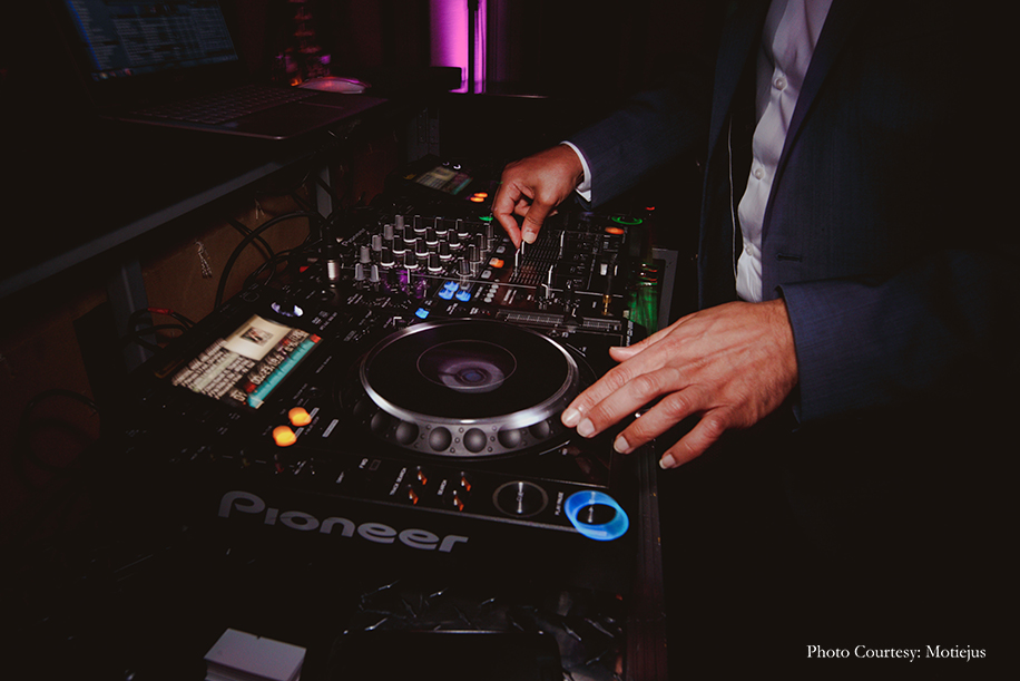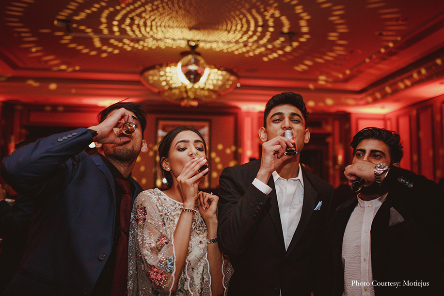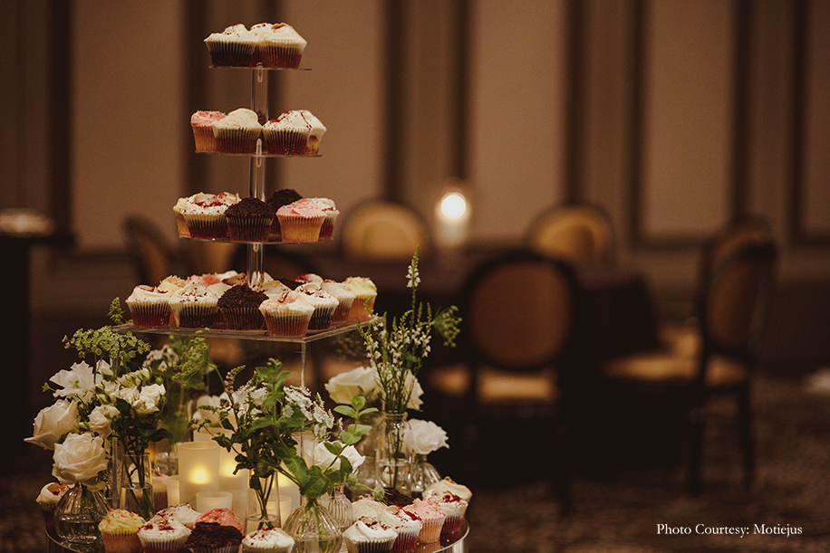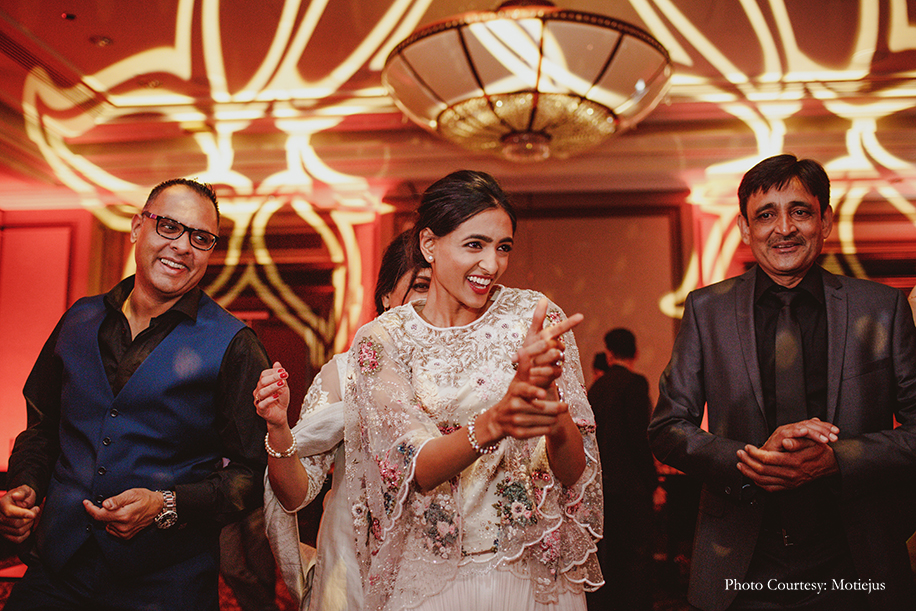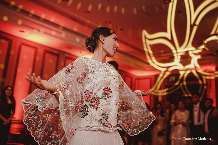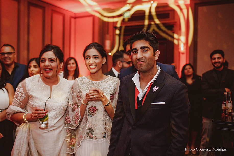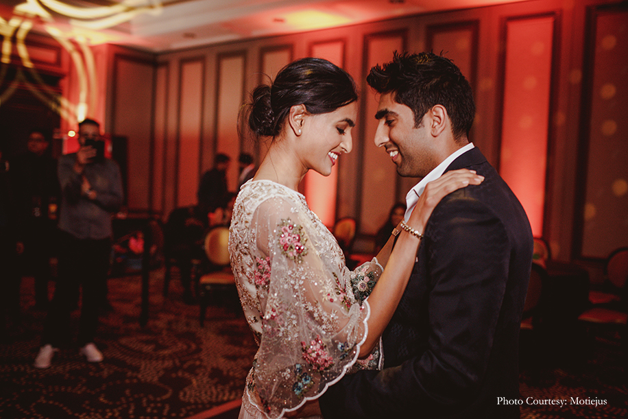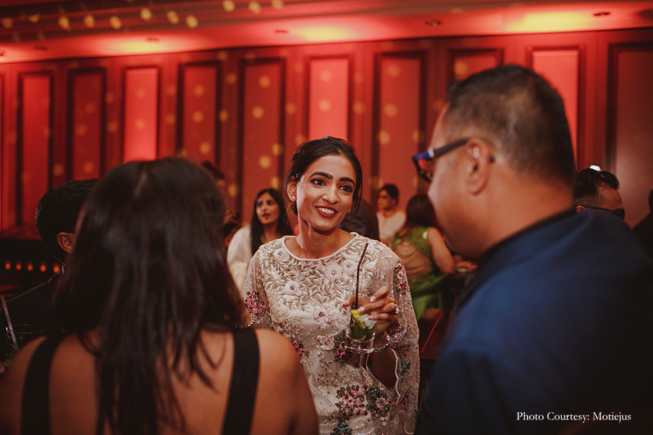 The reception dinner was a nonstop celebration with great food, delectable wine, a DJ spinning hits, and dancing. The groom looked dapper in a chic black tuxedo and a bold red bowtie by Dolce and Gabbana, while the bride wore a flouncy Indo-Western ivory ensemble from Varun Bahl with floral embellishments. She completed her feminine and breezy look with a loose bun, stud earrings and bold red lips.