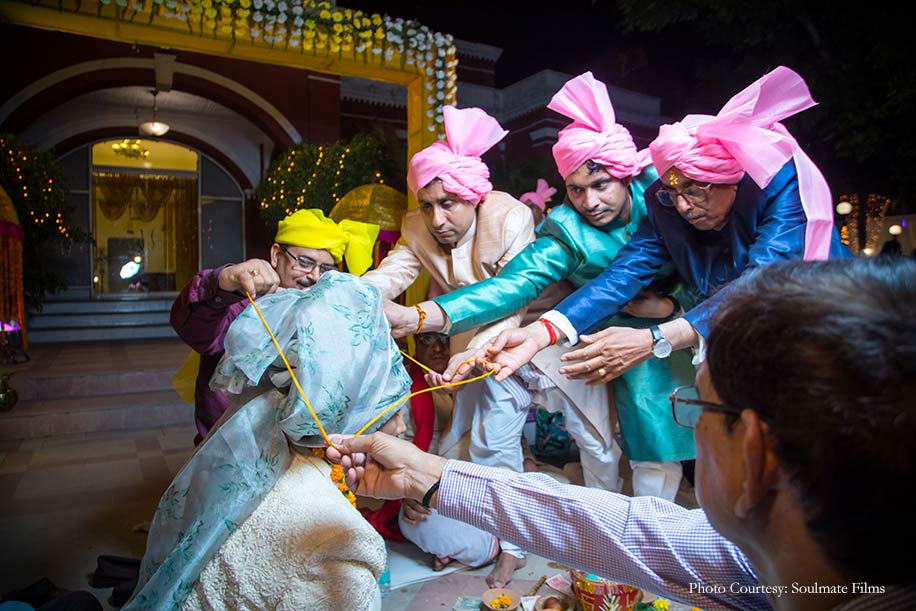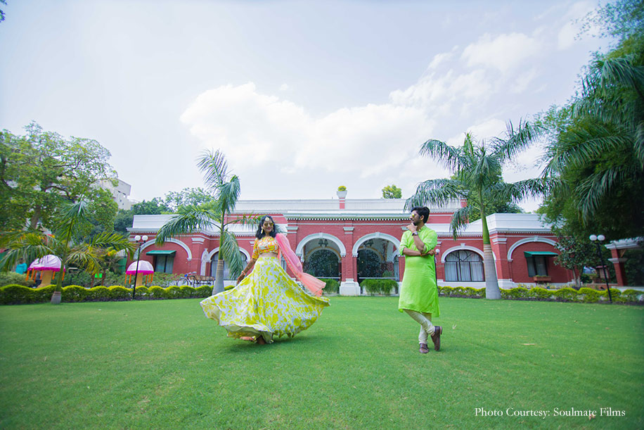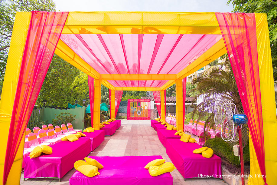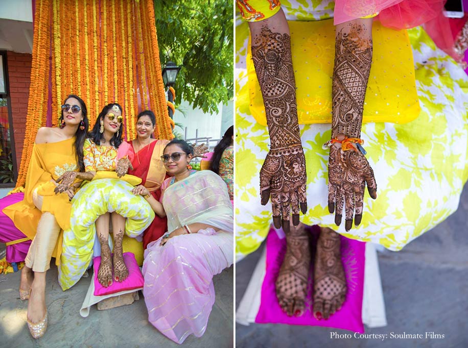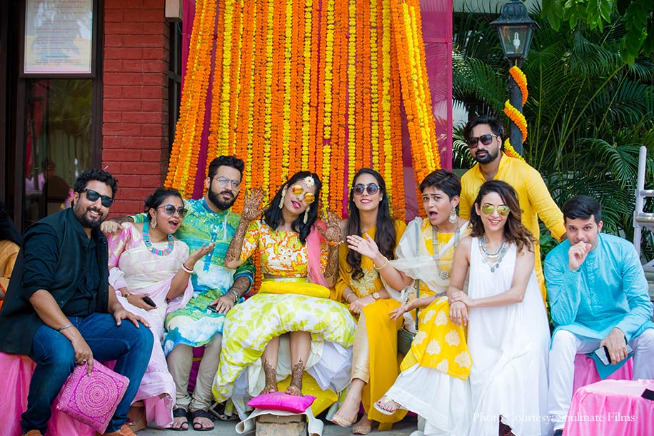 “The mehndi was held by the pool, and the decor was vibrant with hues of fuchsia and yellow. There were small design details such as wind wheels and marigold flowers extravagantly hung to accentuate the colors of the ceremony. There were also coconut water stalls to beat the heat, and guests got colorful bangles and pom-pom earrings as favors. I wore a beautiful yellow lehenga by Mrunalini Rao and accessorized it with bespoke gota jewellery, and Yati wore a bright green kurta from Millionaire which he paired it with a beige waistcoat.”