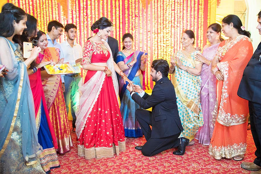 “The sangeet was a very intimate affair. We had a Rajasthani entrance to the hall and beautiful stage with a marigold backdrop. I wore another vibrant red creation by Mrunalini Rao and paired it with ‘chandbaalis’ (crescent-shaped earrings) and a ‘maang tikka’ (forehead ornament). Yati looked dapper in an outfit from Zara.”
