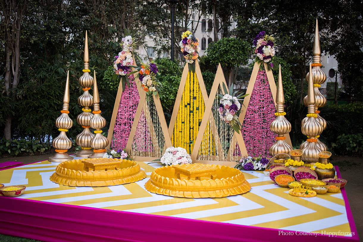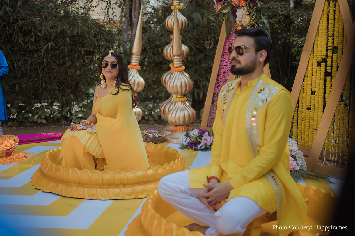 Bright hues of the Haldi function lit up against the lush green lawns of the property for a morning of lively revelries. The decor of vibrant drapes and tons of marigolds filled the occasion with joy. Dressed in matching yellow ensembles, the bride and groom stood out against their guests all of whom dressed up in electric blue and poppy pink, making for stunning visual moments.