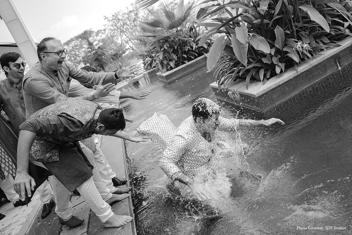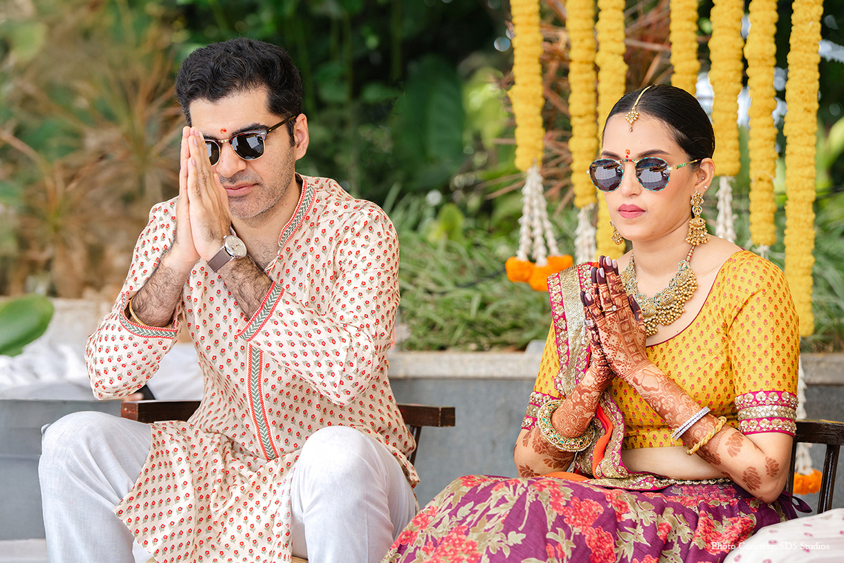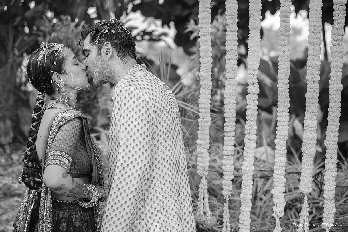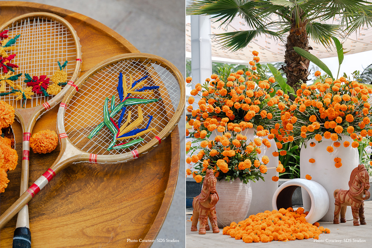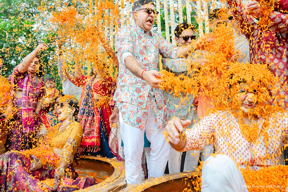 The poolside Mehndi and Haldi celebration unfolded beneath the sprawling branches of a majestic tree, adorned with lively marigold decorations and unique elements like terracotta figurines and embroidered rackets. The bride wore the Sabyasachi lehenga she had donned at her sister’s wedding, adding a sentimental touch to the festivities. The atmosphere buzzed with joy as guests had their hands decorated with henna, while the couple was lovingly showered with flower petals and anointed with haldi, creating a truly enchanting experience.