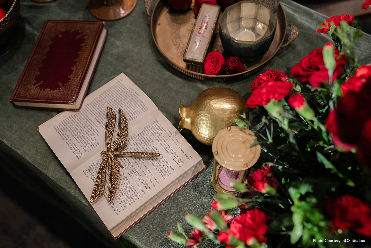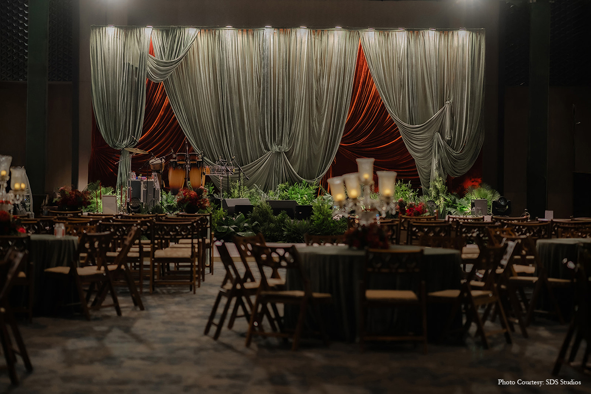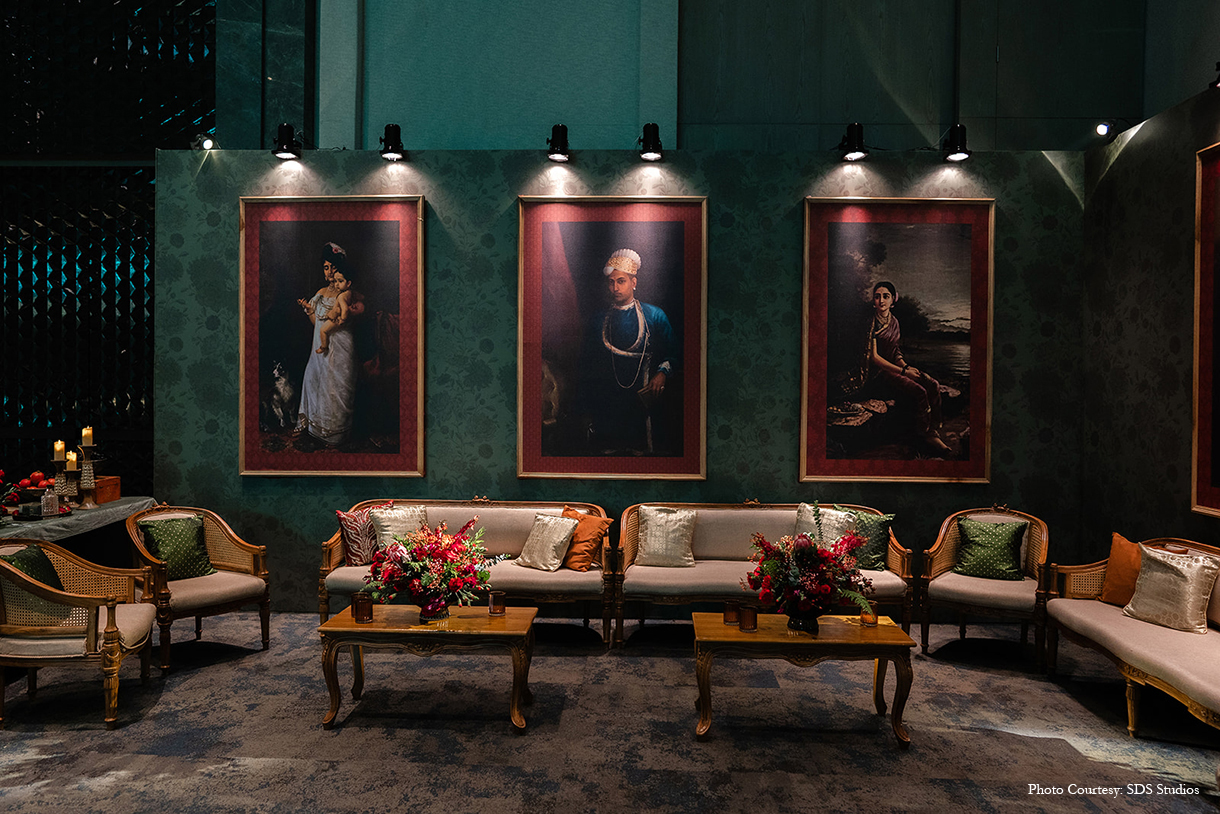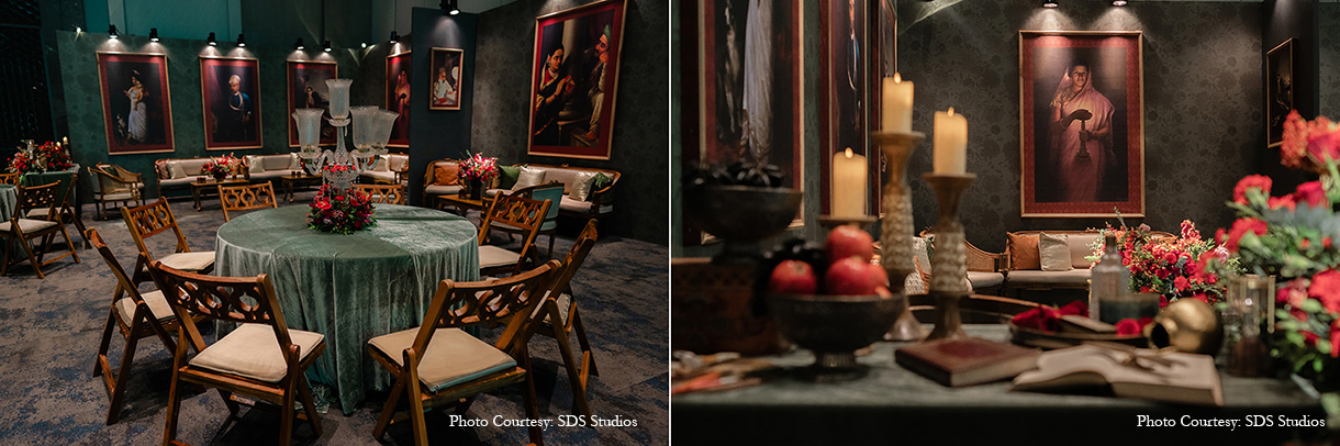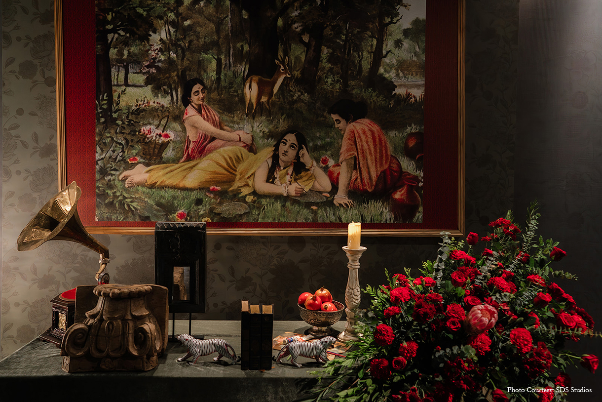 The sangeet exuded an air of vintage elegance, showcasing a palette of gentle greens and rich browns that whispered of understated elegance. Majestic paintings adorned the walls while flickering candles and ornate lamps cast a warm glow throughout the space. Splashes of vibrant red flowers added a lively contrast, creating the ambiance of a royal sitting room. As the evening progressed, the atmosphere transformed with dynamic dance performances from the couple and their family, infusing the event with an infectious energy.