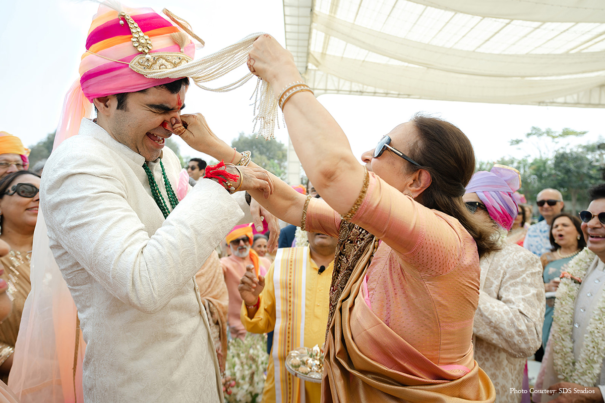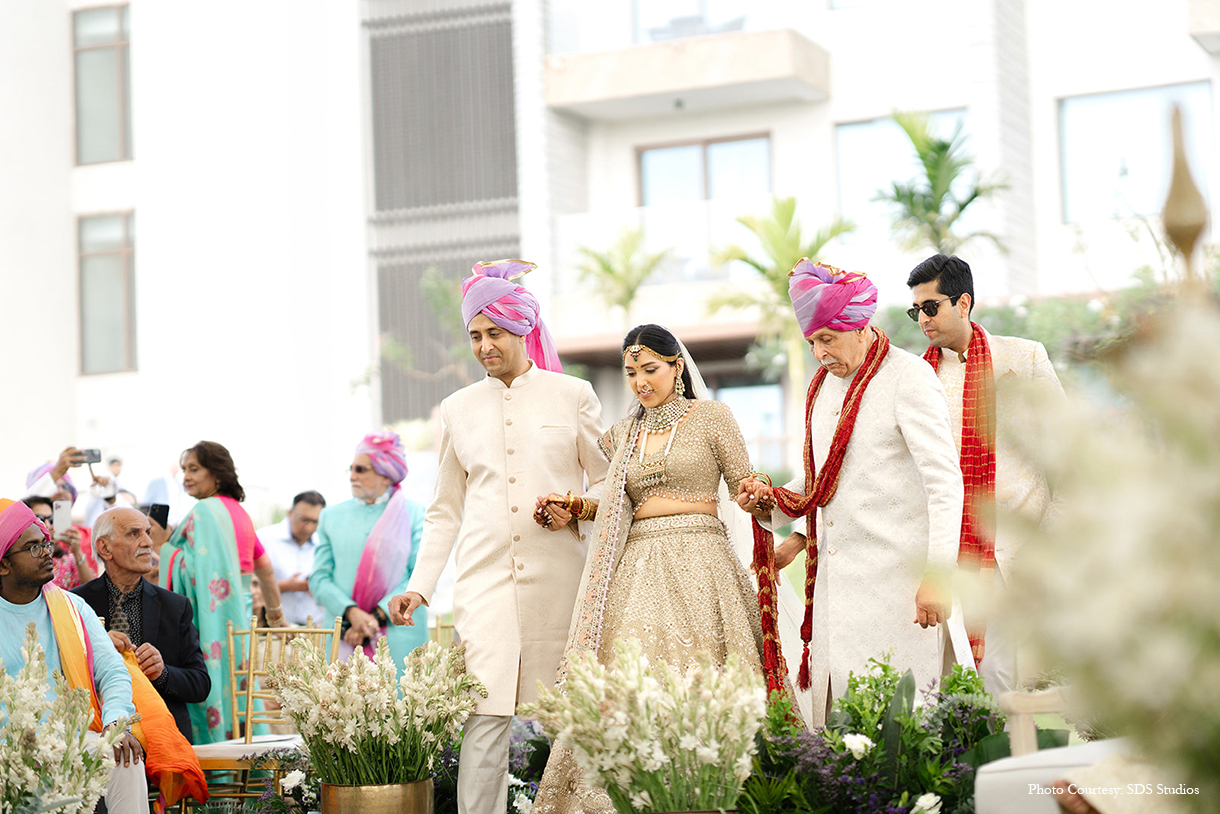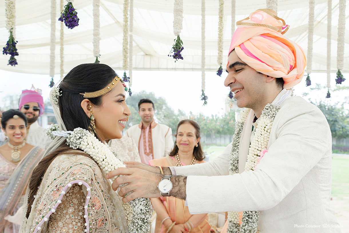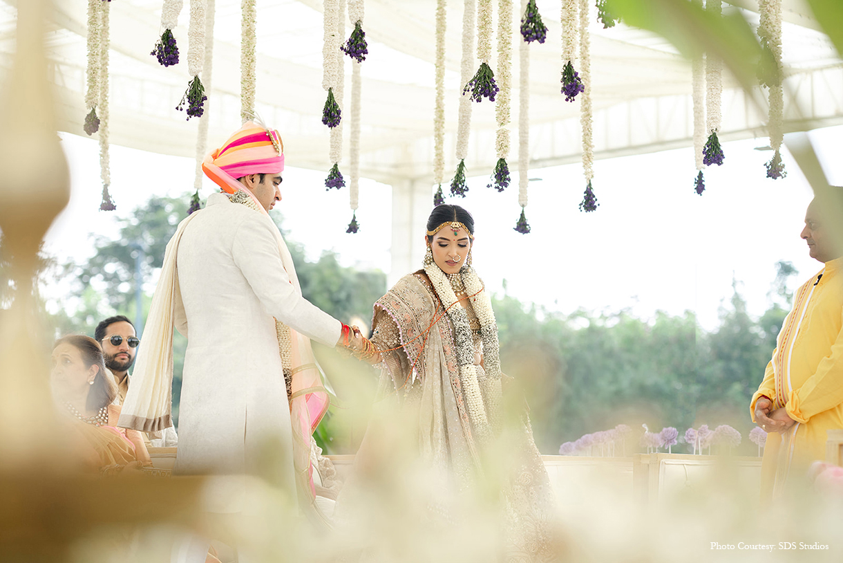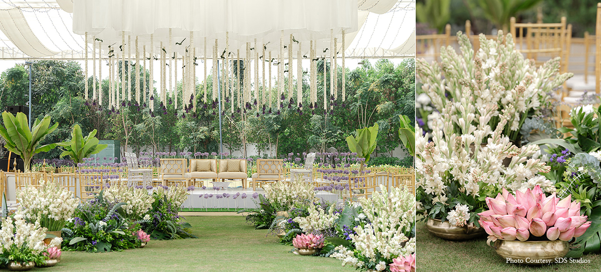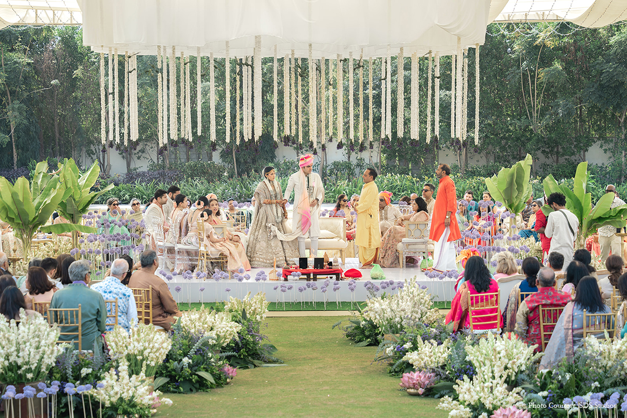 Amidst vibrant greenery, the wedding exuded elegance in soft pastel shades, infused with the captivating scent of Rajnigandha blossoms. Eschewing the conventional mandap, the nuptials unfolded on an ornate stage under a floral canopy. The subtle yet regal palette of beige was imbibed with a refreshing pop of lavender. The bride, donning a beautifully embroidered cream lehenga, harmonized perfectly with the surroundings, while the groom made a grand entrance in a classic vintage car. The ceremony unfolded with moments of laughter and heartfelt emotions.
