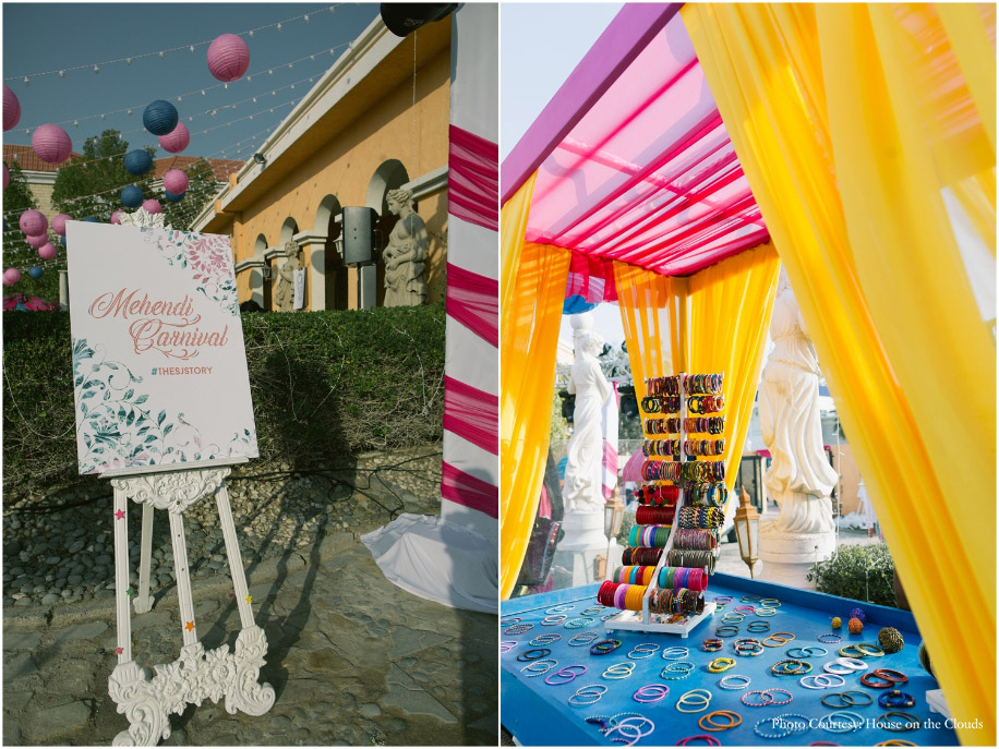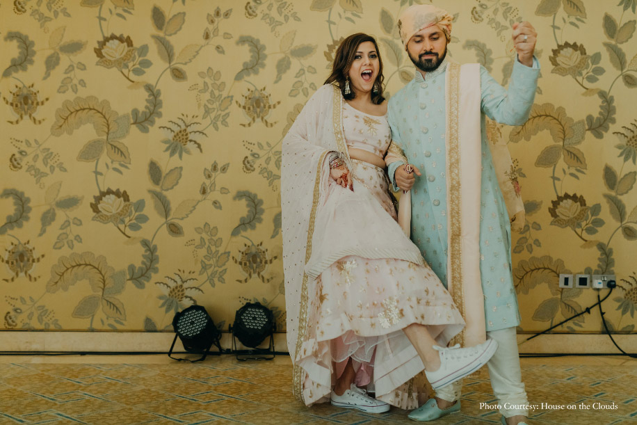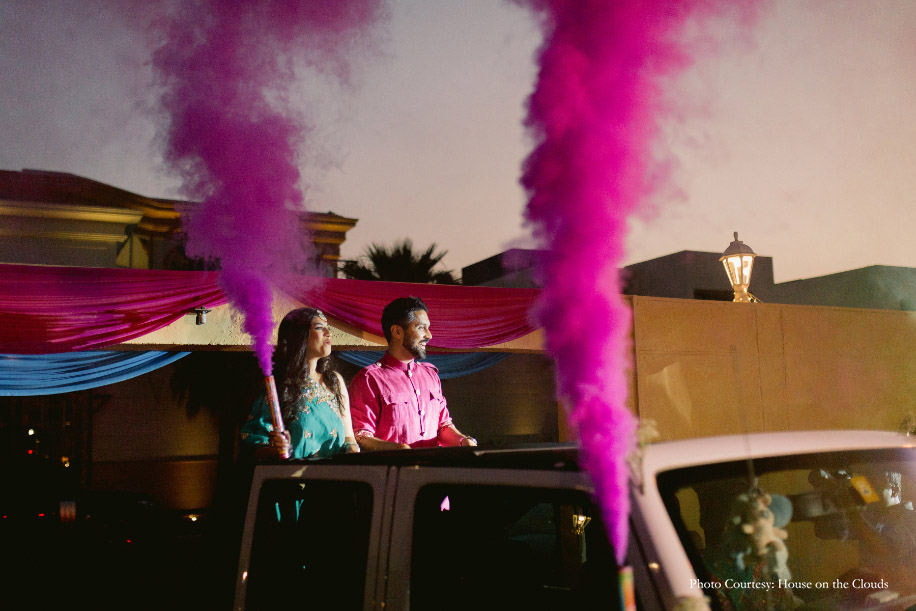 “The mehndi took place at my house, and it was designed to bring both our families together, especially those who had traveled from India to be with us. We wanted to keep it intimate so that everyone got to spend time together and warm up for the next two days. To kickstart the function, we entered in an open top jeep with smoke bombs on the sides of the car. Since we hosted a joint mehndi, we decided to make it look like a carnival. Aside from the women applying beautiful henna patterns, we included entertainment options like live bangle-making and a caricature artist which added some extra excitement to the function. The highlight of the event was a surprise dance for me by Jai and my cousins from Mumbai – all choreographed over WhatsApp!”