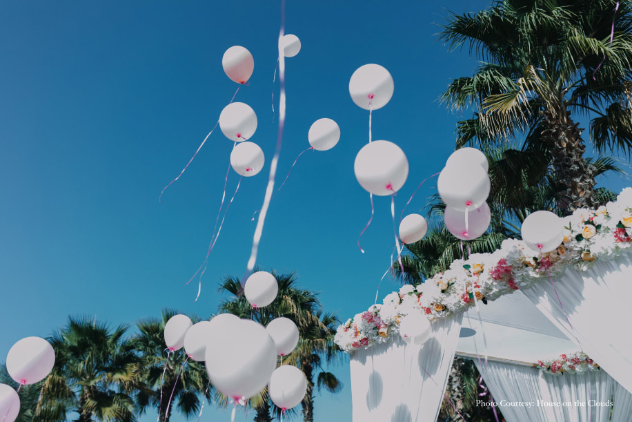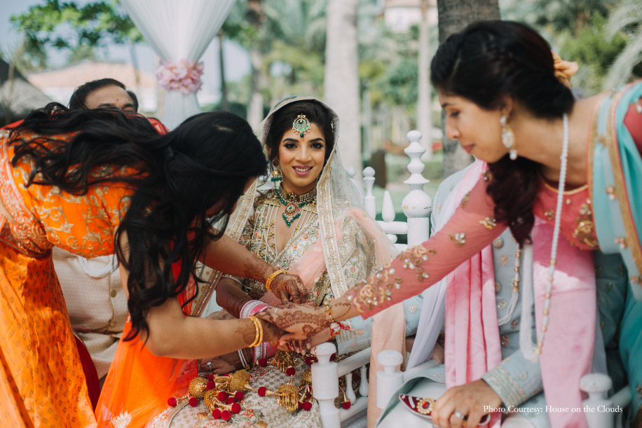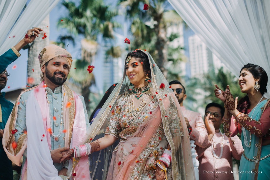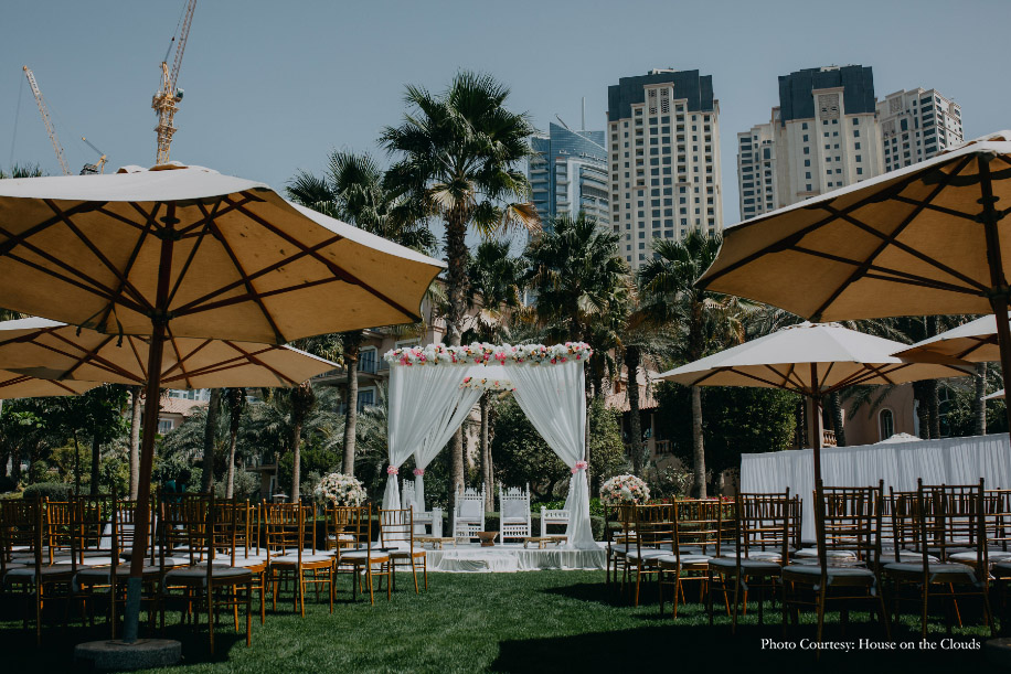“Our pheras were very modern and multicultural. Jai and I wanted all our guests to understand the mantras, so we requested our priest to translate everything into English. That way, our Muslim and Chinese guests could comprehend the various wedding rituals. It was beautiful to see how my extended family, who at first were very skeptical, ended up appreciating the pheras so much. This function was held in the afternoon in the Garden at the Ritz Carlton Dubai. We kept our mandap very simple with white and pink flowers. The garden there is very beautiful, and we didn’t want our setup to overpower that. In keeping with the theme, I wore an ivory lehenga with a light pink and mint dupatta, and my bridesmaids entered wearing mint green sarees. Because I don’t have brothers, my ‘chaadar’ (floral canopy under which a bride walks) was held by my closest friend, my brother-in-law’s and also Jai’s brother. It was a beautiful ceremony bringing two contrasting religions together with love and lots of respect. The pheras ended with our close friends releasing pink balloons as we walked out of the mandap.”