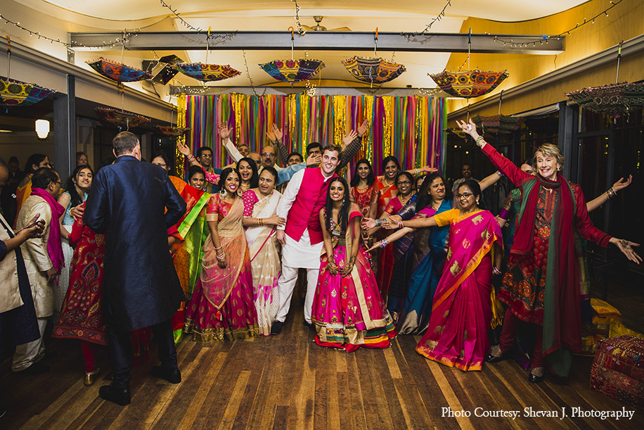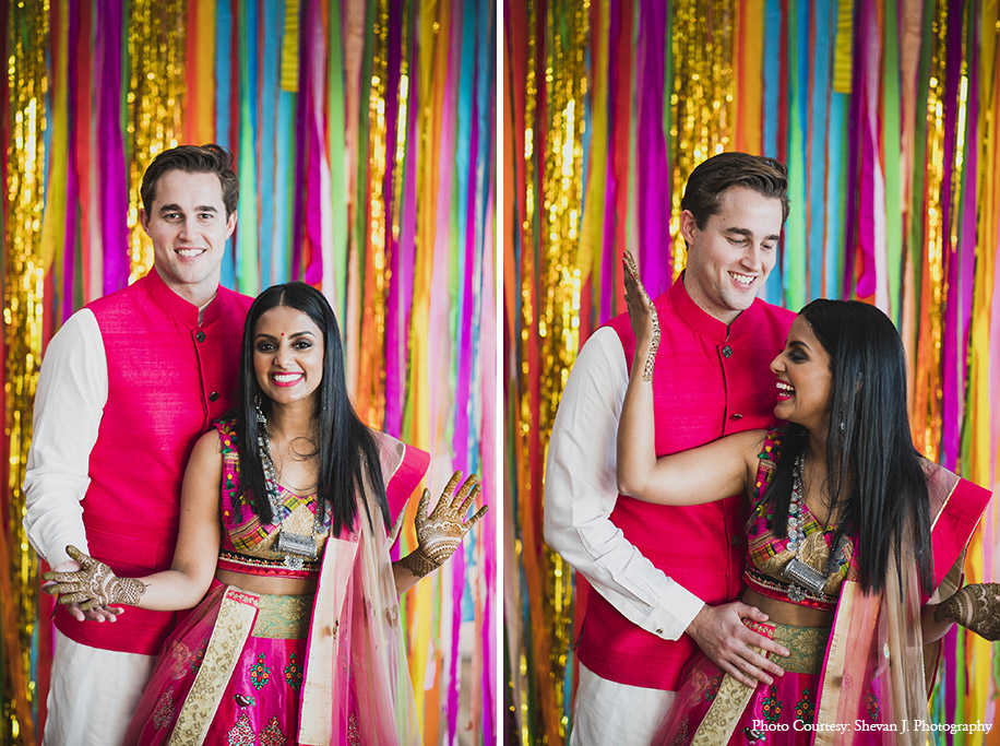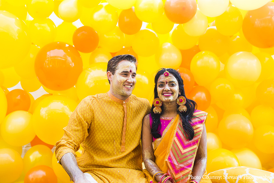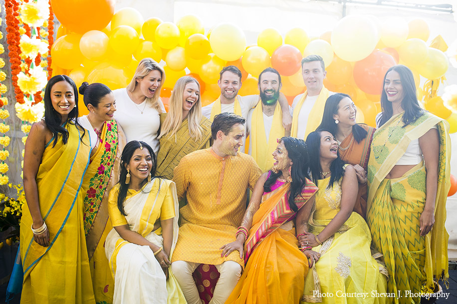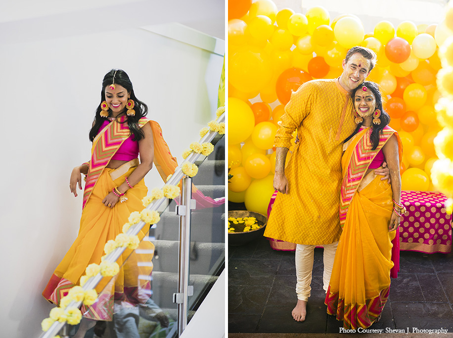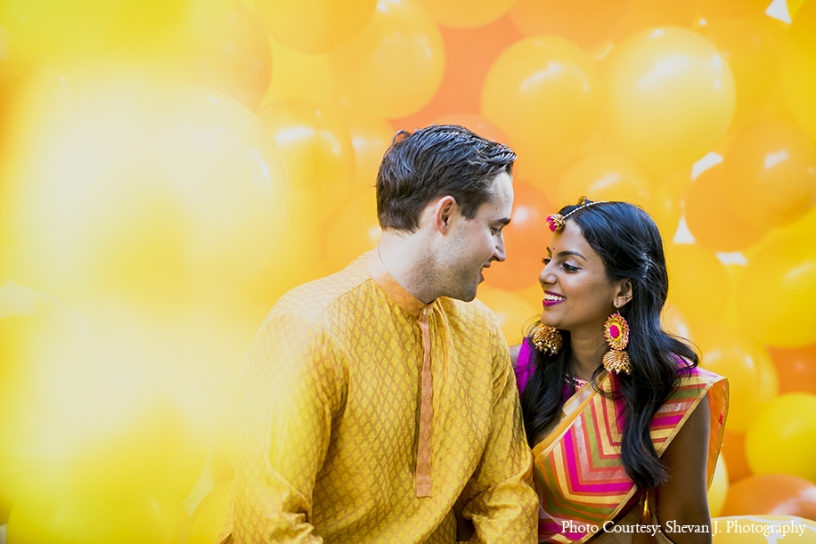 “The haldi was held at my parents’ home. Typically, the haldi is done separately by each side however given Andrew is not of Indian origin, we thought we would make it a lot of fun and involve him and his family and friends in one big event – this way they could see what our Indian culture is all about. It was an intimate and fun event with approximately 50 of our closest family and friends and a great way to kick off the wedding festivities. Our theme was yellow and to make the event as fun and joyous as possible, we had a large balloon feature wall which brought a lot of fun and added even more color to the day.”