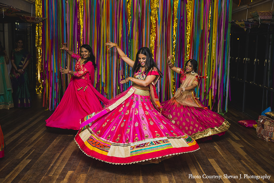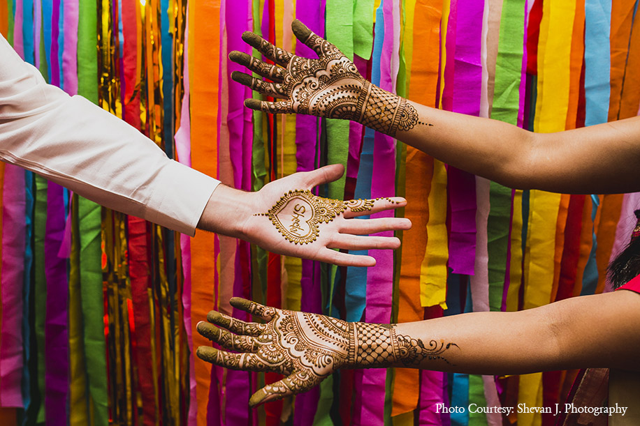 “The mehndi was held at West Beach Bathers’ Pavilion which is located right on the beach in St. Kilda, Melbourne. The venue is a historic pavilion which has been restored. It has a lovely rustic, beach-side charm to it. The theme for the event was bright and colorful, and we incorporated lots of bright pink accents. We had a multicolored streamer wall which was the perfect backdrop for all the fun dancing, Rajasthani-style umbrellas hanging from the roof, a photo booth with customized props, and a fun rickshaw which was very popular with the guests! We served street-style food including chaat, and for many of our guests, this was the first time they had tried this type of food, so it was a big hit. The night ended up being a bit of a party with everyone getting on the dance floor and a ‘dhol’ (traditional Punjabi drummer) player to keep us going!”
