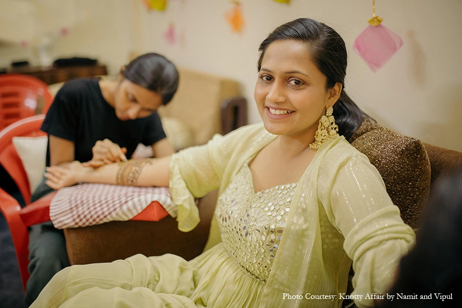 A merry affair where the bride got henna patterned on her hands and feet surrounded by her besties, the Mehndi event brimmed with laughter. Looking comfy yet stylish in a palazzo set, the bride basked in the love of her friends and family.