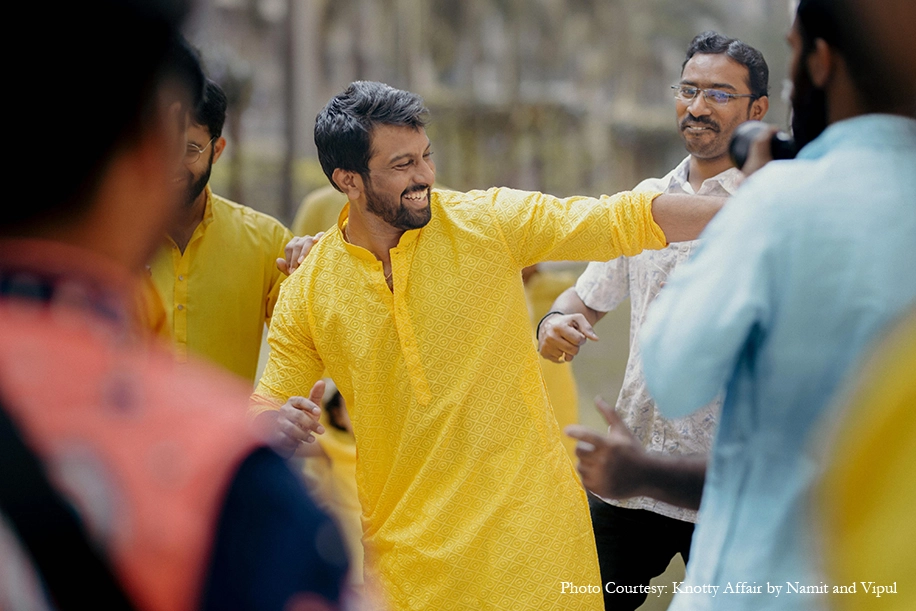 For Namit, the Haldi was purely a Maharashtrian event as he was playfully slathered in turmeric while wearing a traditional white Maharashtrian groom topi. With everyone wearing yellow hues, his Haldi event had everyone showing off their best moves under the sun!