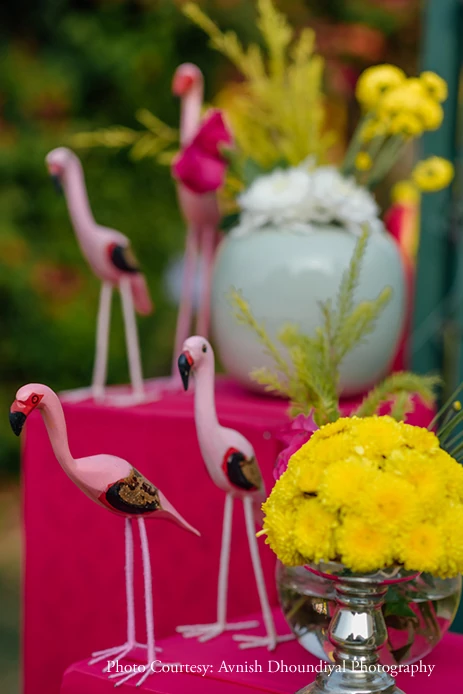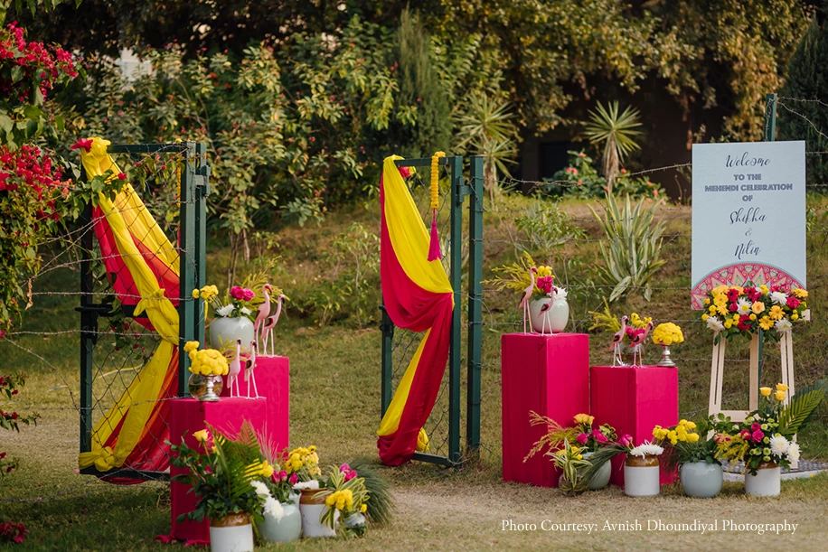 A vibrant confluence of pink and yellow, the Mehndi festivities looked beautiful against the lush greenery of the venue. Quirky elements such as flamingoes, dreamcatchers, parrots and more, added a fun vibe to the bright drapes, cabanas and flowers. Dressed in hues of blue and white, the couple perfectly complemented the décor.