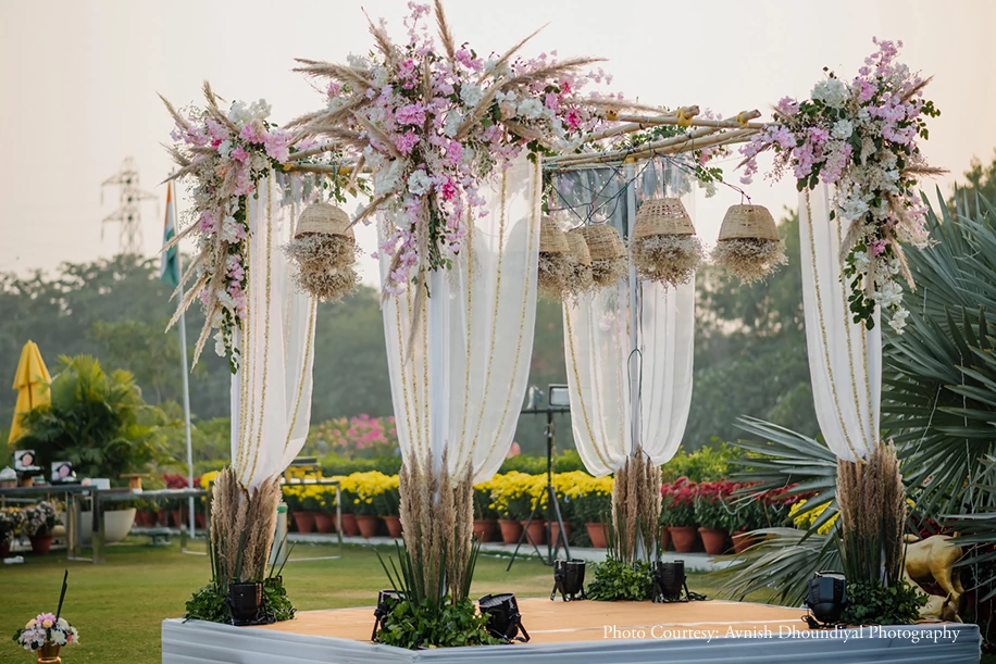 The sundowner wedding was themed around romantic hues of blush pink which came alive under the rays of the setting sun. The boho-chic mandap saw a canopy of flower baskets, as well as festoons of blooms and pampas grass. The groom complemented the décor in an intricately detailed ensemble of white and pink, while the bride stood out in a teal blue lehenga for the pheras.
