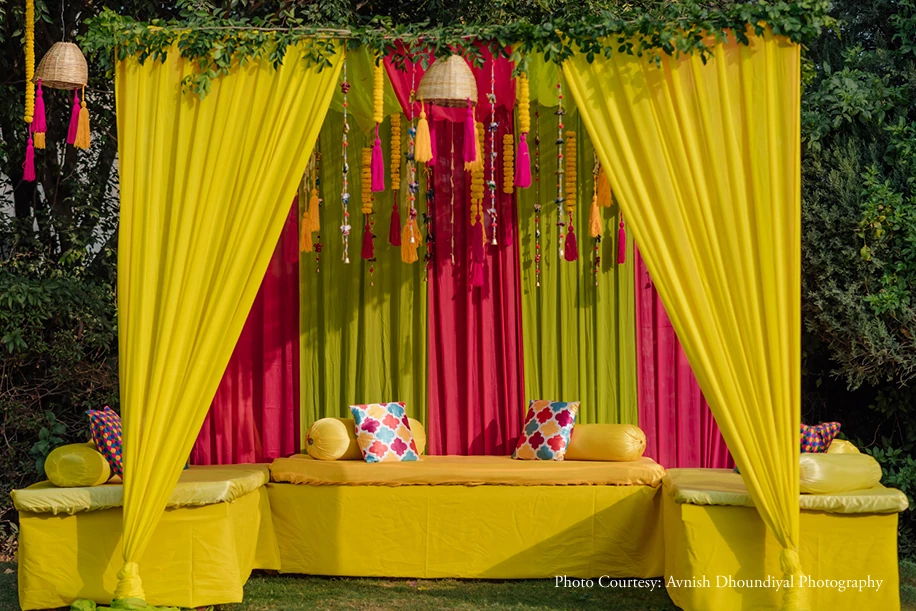 The next day commenced with a function as vibrant as the day before, celebrating the Haldi rituals. Hues of yellow, white and pink ruled the lively décor. The bride wore a lime-green saree, teamed with a shimmering belt and floral jewellery, while the groom kept it sunny with a yellow kurta. Seated in front of a quirky backdrop of white and yellow tassels, the couple was smeared with turmeric paste by their loved ones.