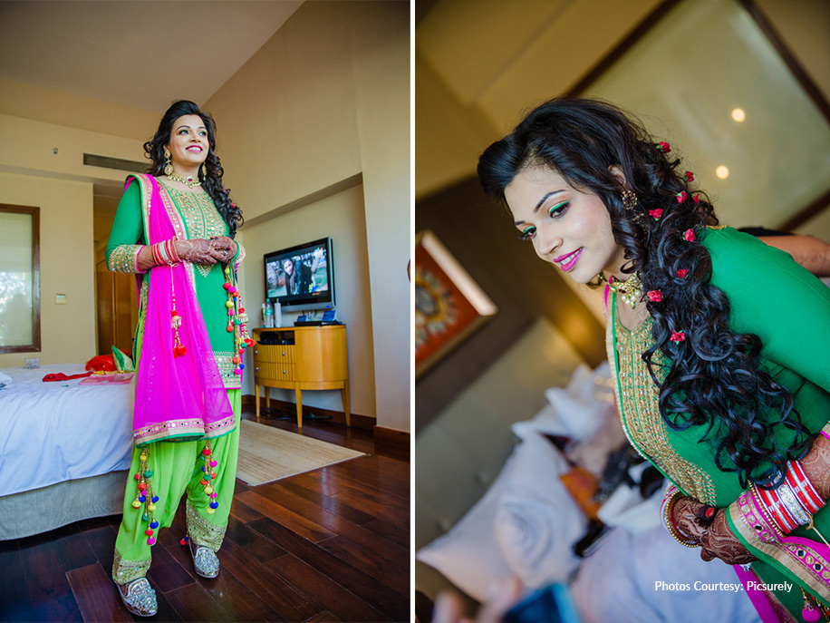 “We had two mehndi functions. The first one was organized on a small scale in Jaipur before we left for Udaipur. The other one took place at the Radisson Blu Udaipur Palace Resort & Spa and was inspired by the vibe of boisterous Punjab. For this function, the venue was decorated in vibrant colors to mark the beginning of the festivities. We had ‘bhangra’ (traditional dance from Punjab) dancers and ‘dhol’ (ethnic drums) players adding a touch of revelry and authenticity to the event. We even incorporated colorful ‘parandis’ (fake plaits with tassels) and oil lamps and lanterns that are typical of the Indian countryside into the decor. I matched the vibe by wearing a bright green Patiala suit with a contrasting bright pink dupatta, while Rahul wore a cream waistcoat with orange floral motifs over a matching peach kurta and a pair of white churidaar-style trousers.”