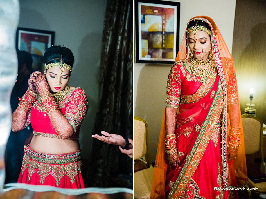 Our wedding followed a red and golden color scheme and the venue looked stunning in the evening. Our mandap was constructed on the lawns of the hotel. The entire structure was draped in red and there were beautiful floral wreaths with strands of white and red blooms dangling down which created a striking effect. For the ceremony, I wore a red lehenga with orange and green accents, while Rahul wore a blue sherwani with ornate silver threadwork. He also wore a red turban and matched it with a red statement necklace.”
