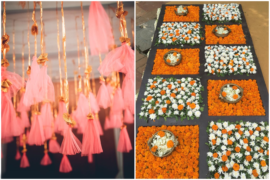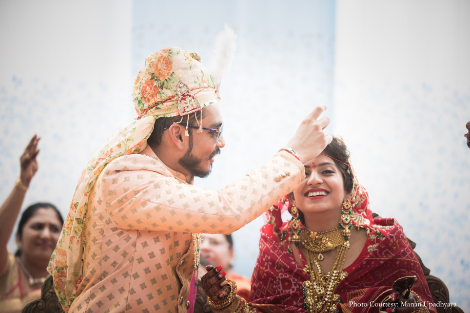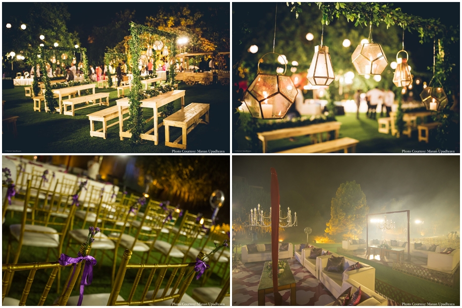 “My wedding functions started ten days before the wedding. Since my dad was over excited about it. I had many traditional functions and pujas, but the main ceremonies started with a ‘paath bithai’ ceremony which officially marked the start of the wedding. I had haldi and mehndi functions, a South Indian Night as well as a ‘Rajasthani Night.’ These were kept low-key with just family and friends attending. Before the wedding, we had a musical afternoon where we organized a musical housie. The decor for this was colorful with low seating. This was the ice breaker for the wedding and in the evening, the sangeet was held where the Kakar sisters performed. The decor for this function was rustic with beautiful geometric lights. The wedding day began with the baraat followed by the outdoor pheras and ‘varmala’ (garland exchange) ceremony in the afternoon. Our mandap featured white and powder blue hues with lotus block prints. I wore a red and peach combination lehenga, and paired it with traditional jewellery including a gold choker and a polki necklace set.”