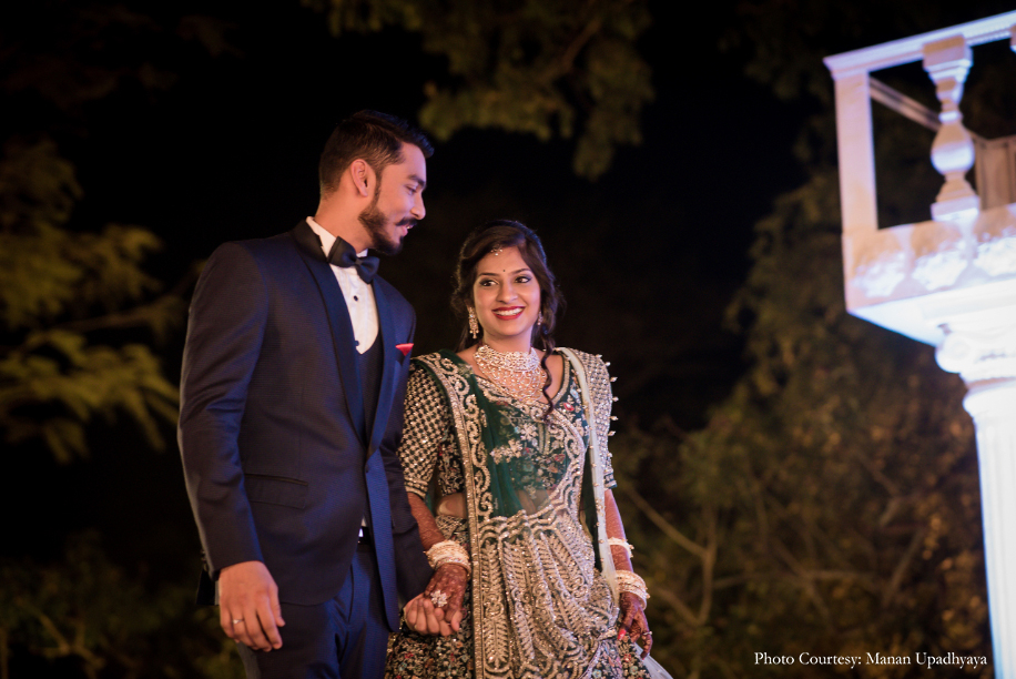 “The next day evening was the reception which had a very royal look from the stage to the eating area to the lounges. I wore a dark green lehenga with a diamond choker necklace set, while Siddharth looked dapper in his classic black tuxedo.”