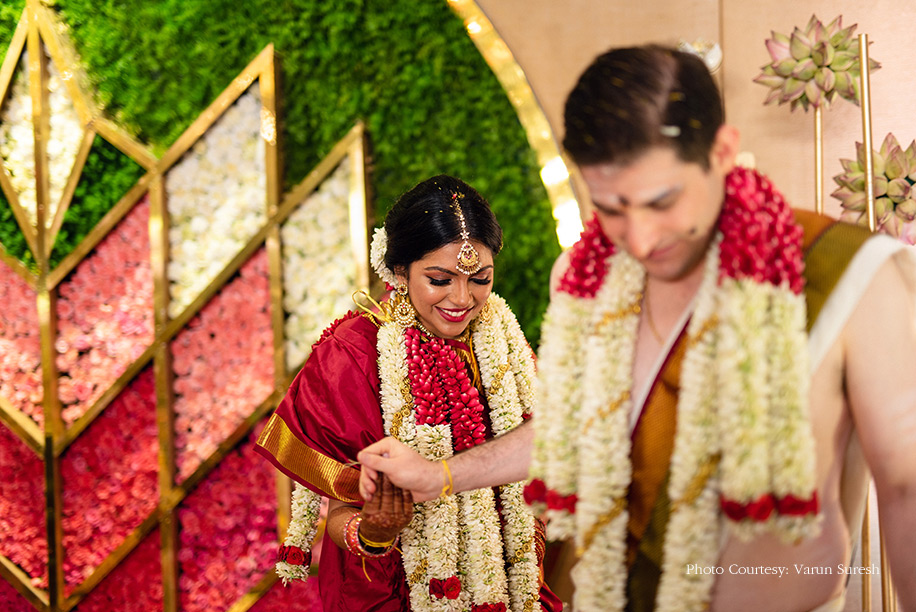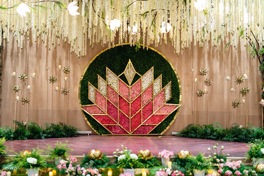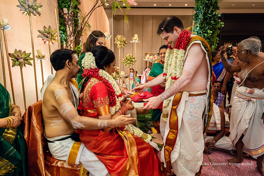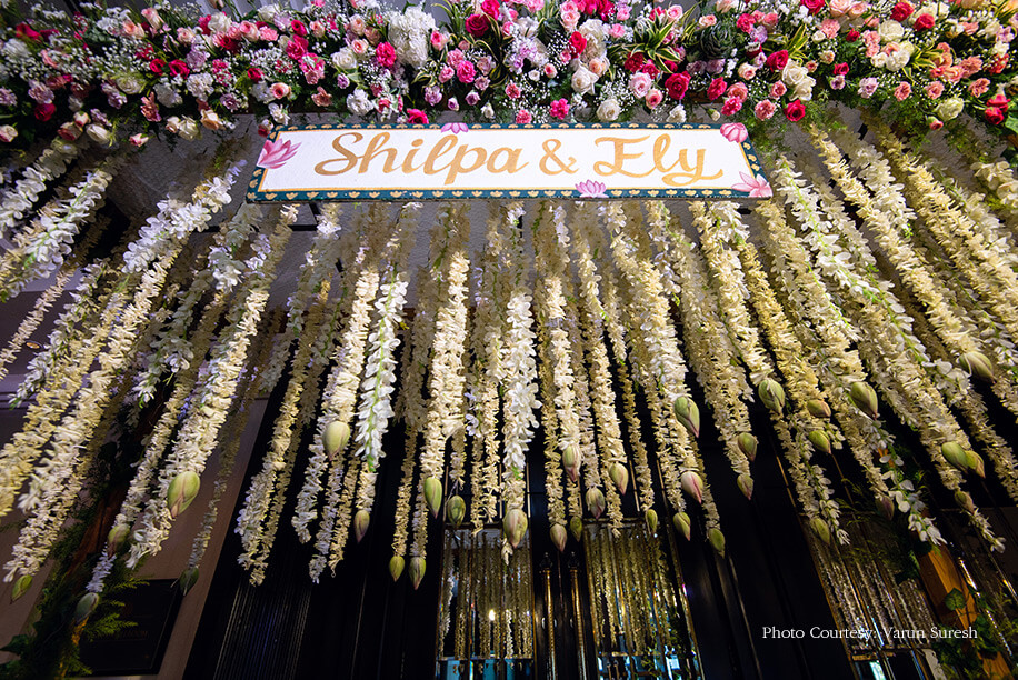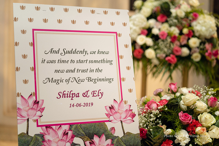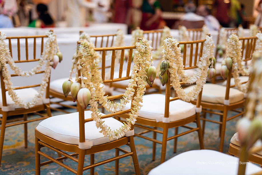 “The decor for our wedding was classic and elegant, with lots of gold and metallic accents that created an Art Deco style. We had a lotus theme because it is my favorite flower and also symbolizes resilience and enlightenment. Through our shared experiences, we have grown into the partners and people we wanted to be and we found that this theme was the perfect way to reflect our relationship.” Speaking about their outfits, Shilpa says, “For the ceremony I wore a red kanjivaram saree from Pothys and a blouse from Yuti Designer Studio in Chennai. Ely dressed in a veshti and angavastram.”