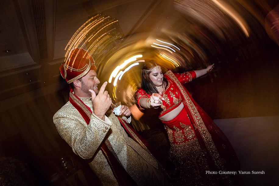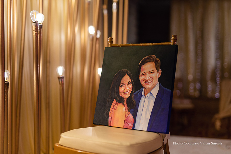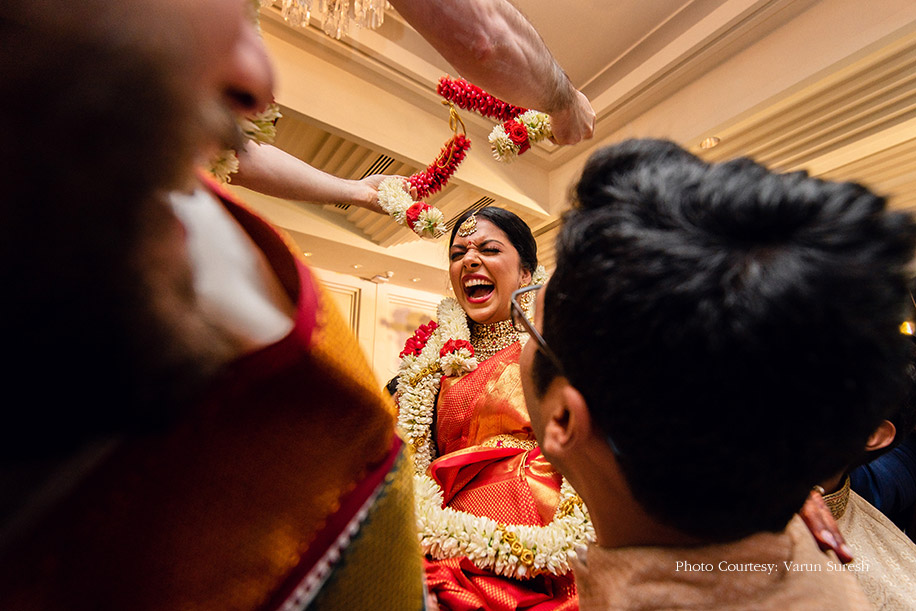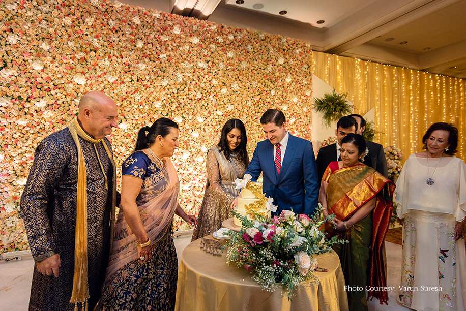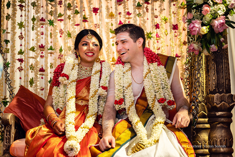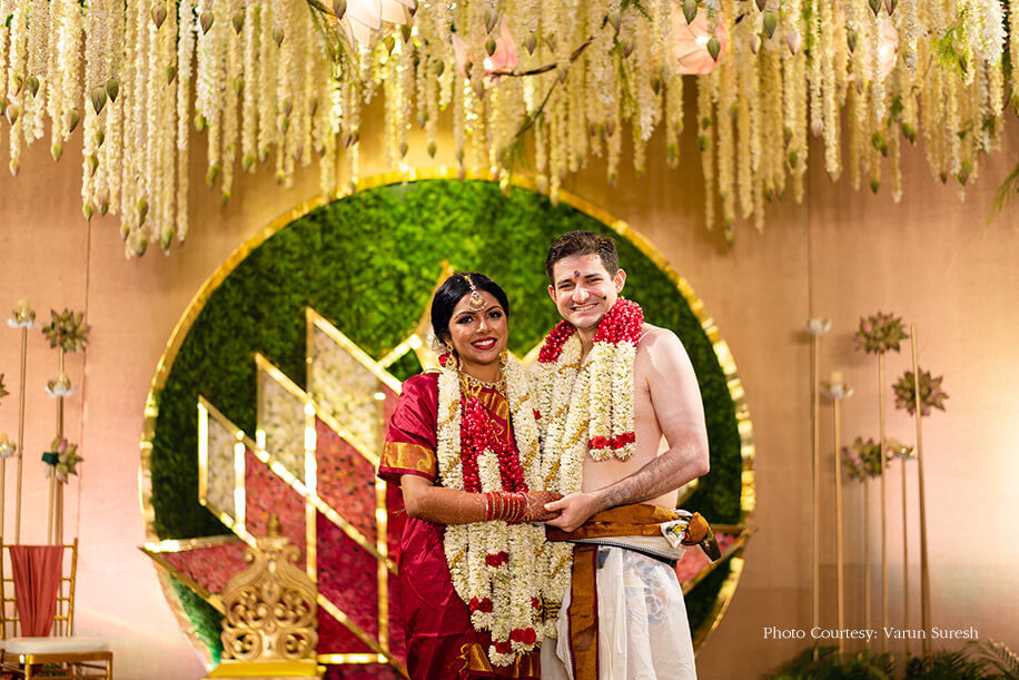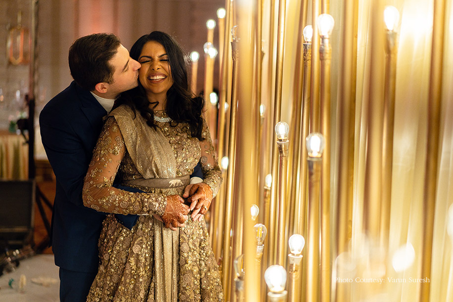 “The decor for our wedding was classic and elegant, with lots of gold and metallic accents that created an Art Deco style. We had a lotus theme because it is my favorite flower and also symbolizes resilience and enlightenment. Through our shared experiences, we have grown into the partners and people we wanted to be and we found that this theme was the perfect way to reflect our relationship.” Speaking about their outfits, Shilpa says, “For the ceremony I wore a red kanjivaram saree from Pothys and a blouse from Yuti Designer Studio in Chennai. Ely dressed in a veshti and angavastram.”