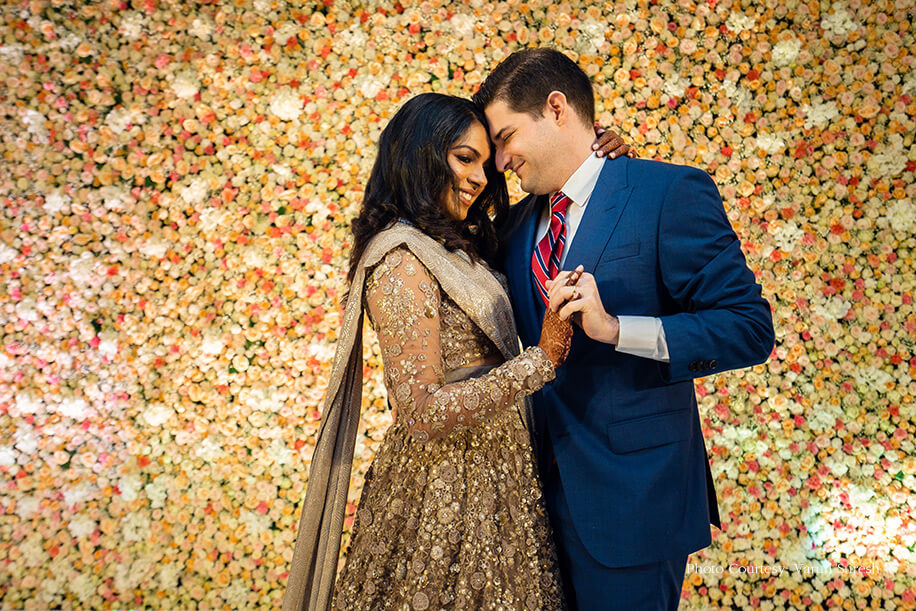 “The vibe for our reception was vastly different from our wedding ceremony. At this function, we created a contemporary ambiance using pastel-hued blooms, golden drapes, fairy lights and glittering chandeliers. Keeping in line with this aesthetic, I wore a gown by Sabyasachi and Ely wore a navy Hugo Boss suit.”