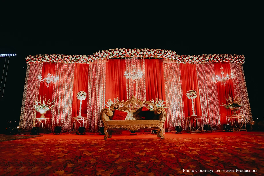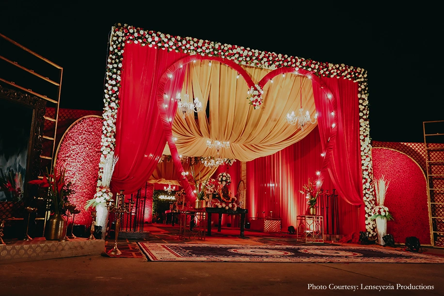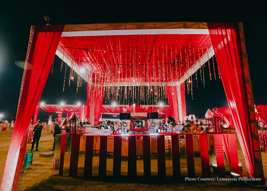 The Bollywood night themed Sangeet function lived up to its name with glamorous decor, a red carpet entrance and an evening of grand dance performances by the couple and their loved ones, as well as a show-stopping one by Ash King. Glitzy decor of red was illuminated with long candle votives and LED vanity lights. The festivities carried on late into the night with endless music and dancing.