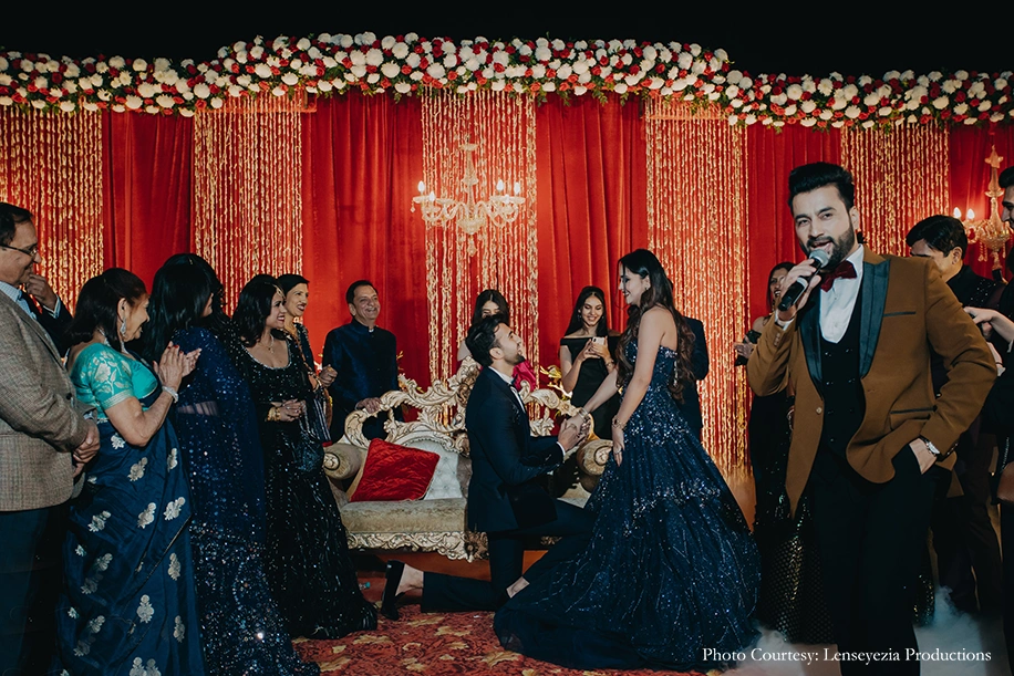 The engagement soiree was high on grandeur with a decor of red and gold adorned with plush elements like chandeliers, drapes and intricate floral arrangements. The bride sported a shimmering midnight blue gown by Dolly J while the groom wore a classic black tuxedo by Gaurav Gupta.