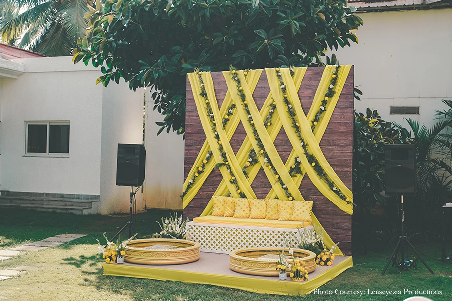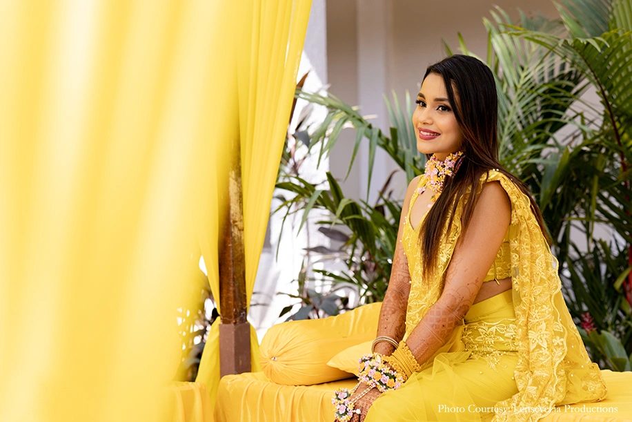 The traditional yellow decor of marigolds for the outdoor Haldi function got a modern update with drapes, spring blooms and wooden elements that set a fresh, breezy ambience. The couple twinned in yellow ensembles, as did their loved ones.