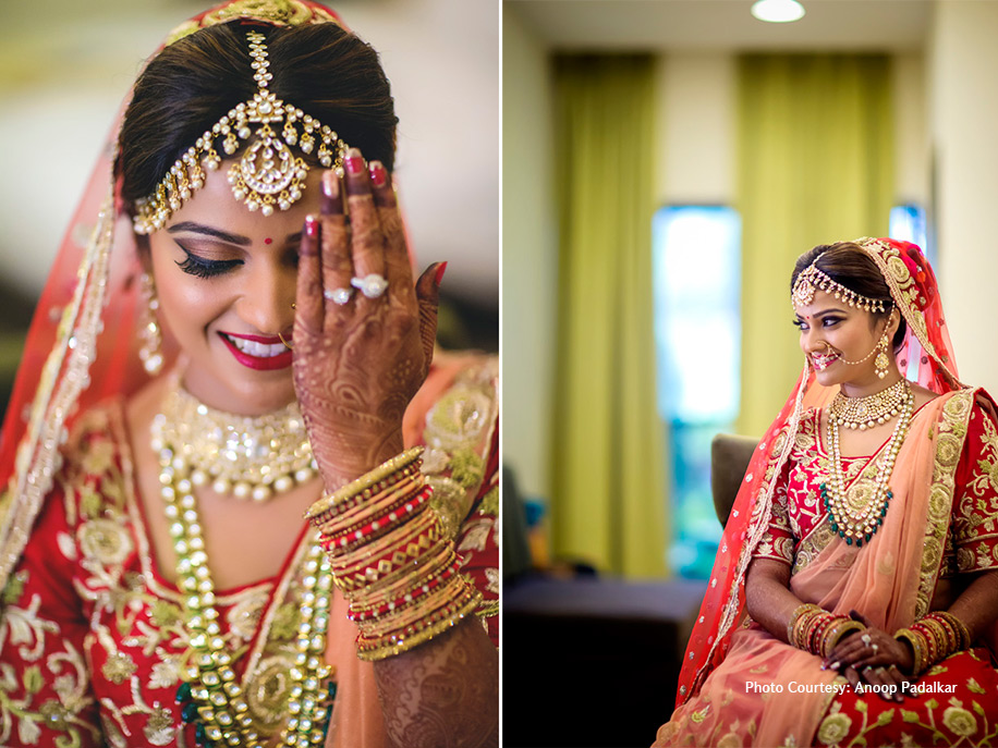 “Unlike the norm, I decided to wear different outfits for my pheras and ‘varmala’ (garland ceremony). I had always wanted to wear red as a bride, so for the varmala, I went for a red lehenga from Legacy Studios, and had them customize the outfit as per my taste. To complete this royal look, I paired it with the perfect ‘mathapati’ (forehead ornament) and uncut diamond jewellery. Since I did not want to repeat my ‘varmala’ outfit for the pheras which many people suggested that I do, I went for a banarasi dual tone lehenga from Mumbai’s Ratanshi Kheraj Sarees and got it customized at Legacy Studios. I wore traditional ‘jhumkas’ (long ethnic earrings) to match the look of the lehenga.”