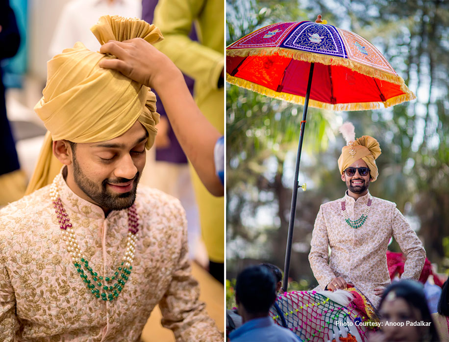 Chiran made an entry to the wedding on a horse. A colorful umbrella over his head added that traditional color to his appearance. Clad in a cream sherwani with intricate dull gold embroidery, Chiran looked regal in his matching turban and necklace.