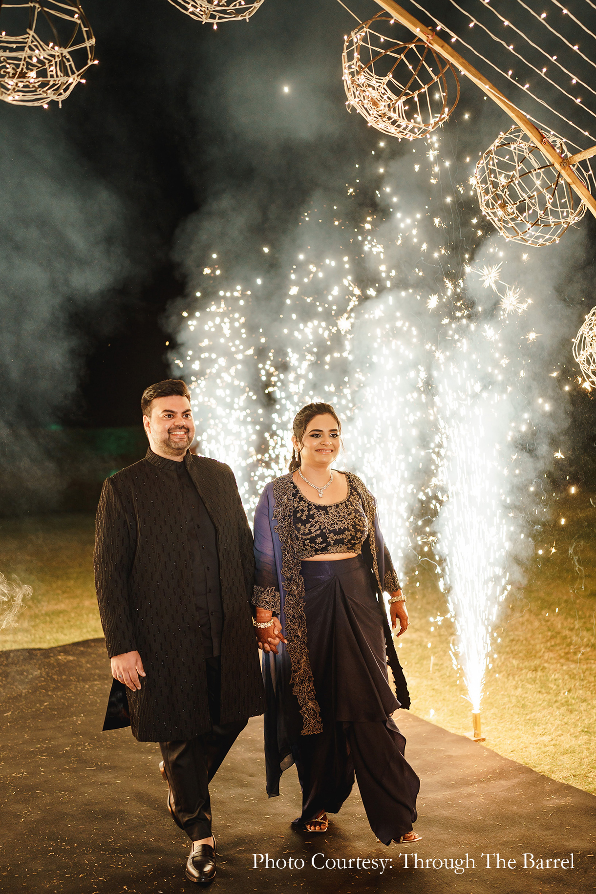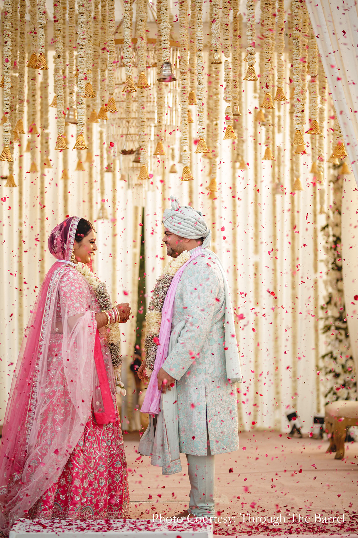 Shreya shares, “We had three essential needs for our wedding which we conveyed to our wedding planner beforehand – floral shower, a mirrored walkway and lots of sparkles, For everything else, we let their creativity take the lead. Eshan wore a light blue sherwani and entered the venue atop a blue vintage car. On the other hand, I wore a fuchsia lehenga with small blue flowers matching Eshan’s sherwani. My bridal entry had the song, ‘A thousand years’, playing in the background and entered under a phoolon ki chaadar. And, as planned the varmala moment was punctuated by a rose petal shower.”