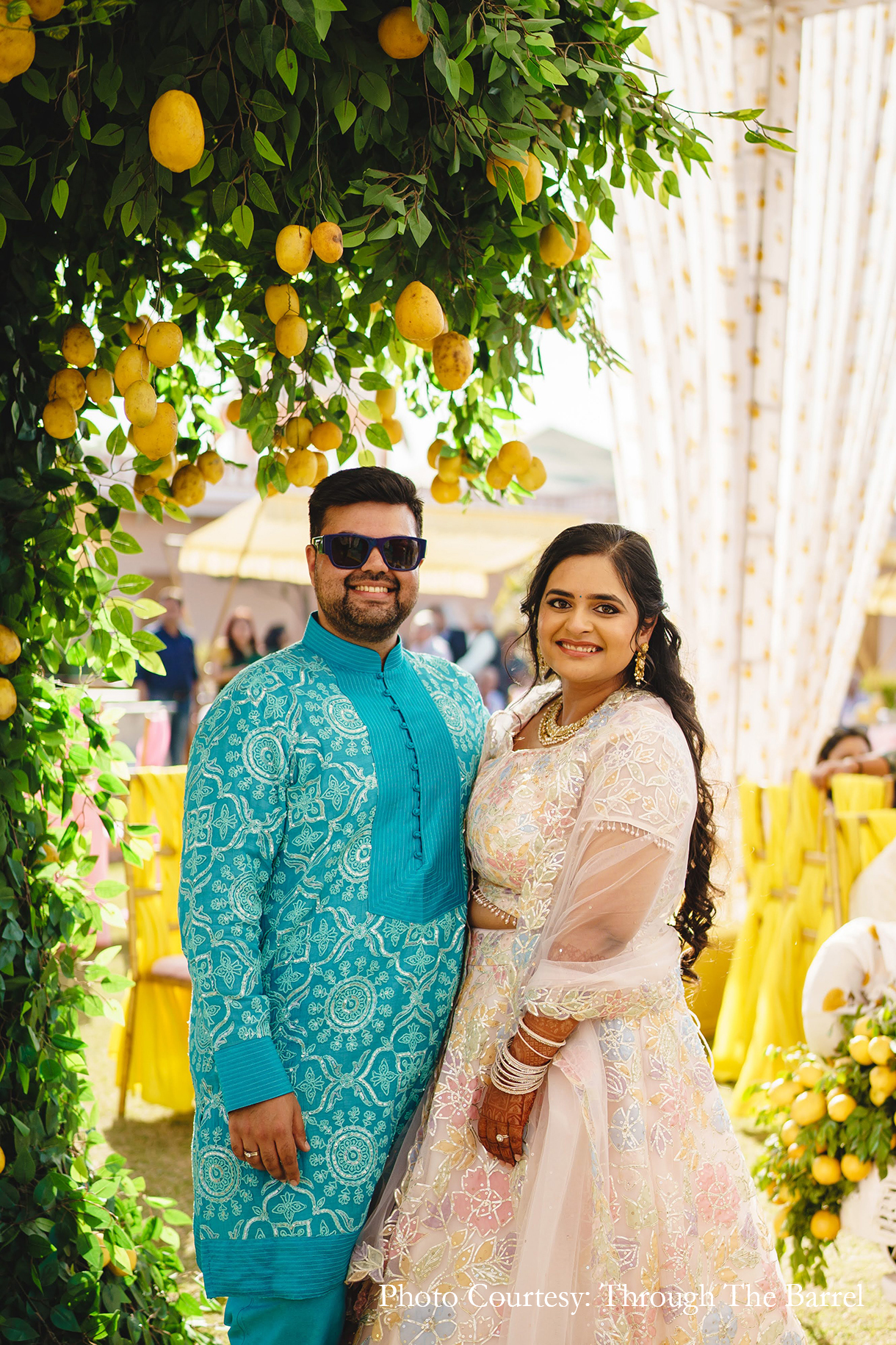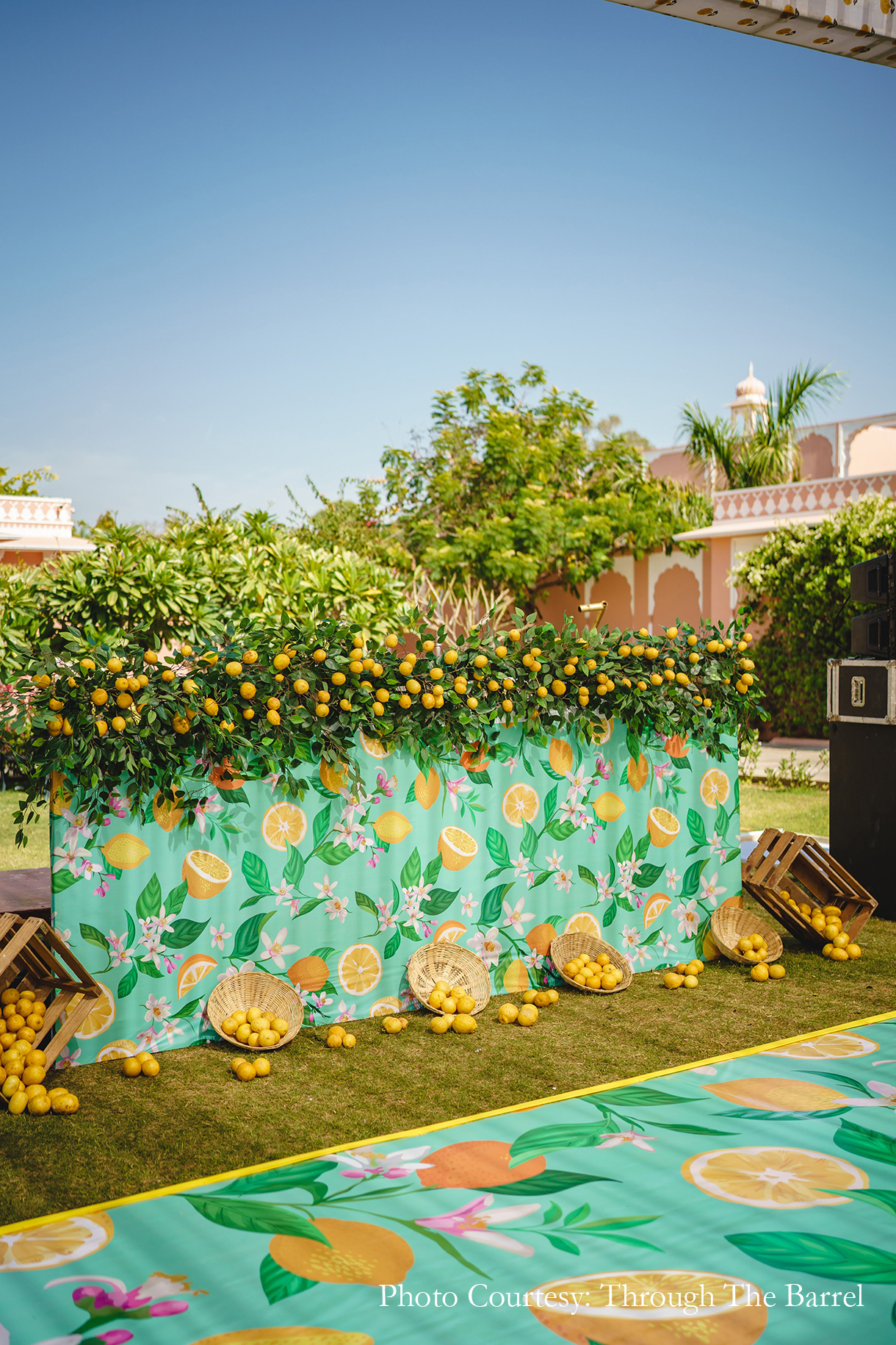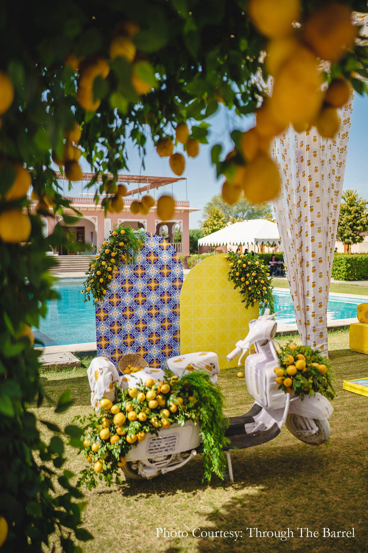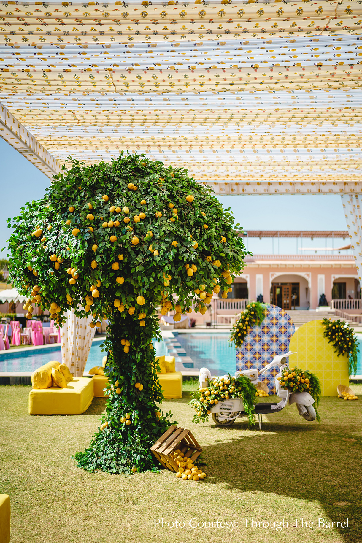 Shreya shares, “Set by the poolside, our lemon-inspired Mehndi with Moroccan hints also doubled up as a welcome party! We had 35kgs of fresh lemons brought from Himachal to make up our décor elements. We had a beautiful Lemon tree and a white Vespa for our guests to pose in front of. The bar and dance floor had a lemon theme to it as well. The bar menu was customised with the theme and featured a margarita bar.”