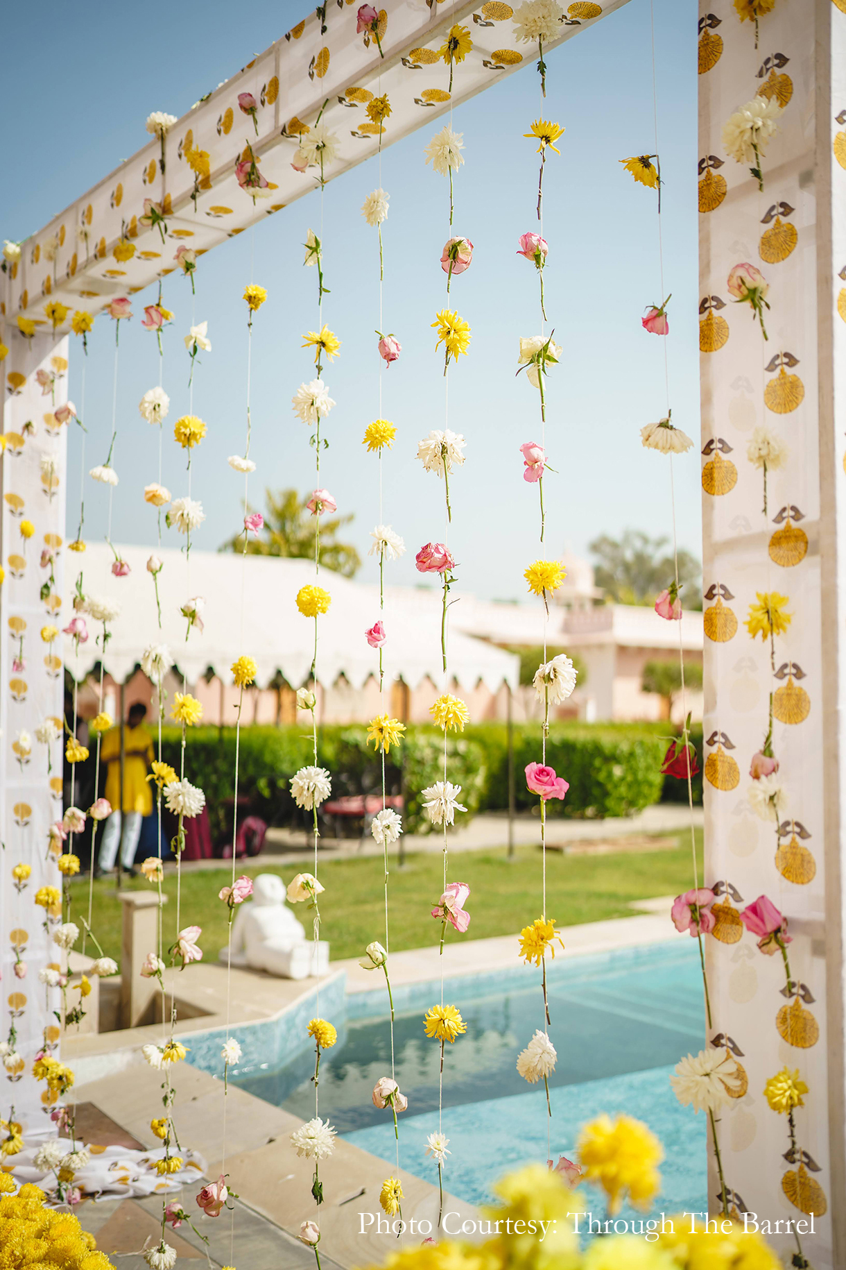 Hosted by the poolside, the haldi had a playful vibe to it as Shrey shares, “A carpet of yellow flower petals welcomed the guests and suspended blooms in the backdrop made every picture at this event look perfect! We wore green rather than the usual yellow to stand out against the floral backdrop.”