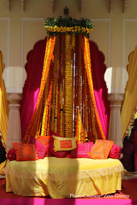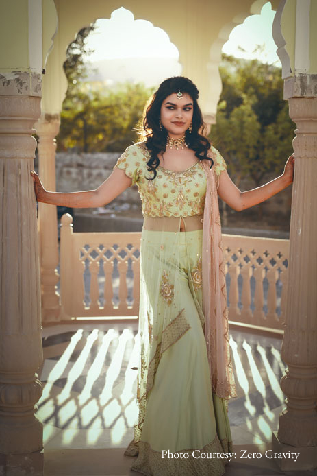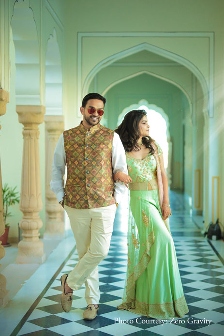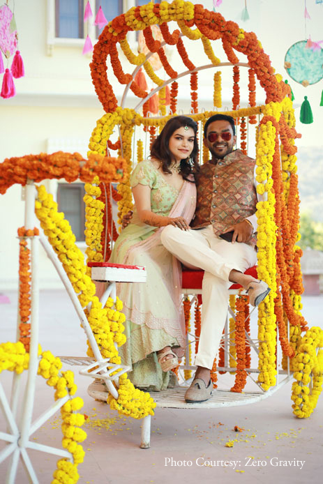 Their mehndi was a breezy function by the poolside. The couple, with the help of Gunjan Singhal Designs, kept the vibe fun through colorful decor, with drapes, bright flowers and hangings adorning the venue. The bride’s lime green sharara from her own label, Shopviolla, shone bright in the sunlight, while the handsome groom wore a smart-looking printed Nehru jacket.