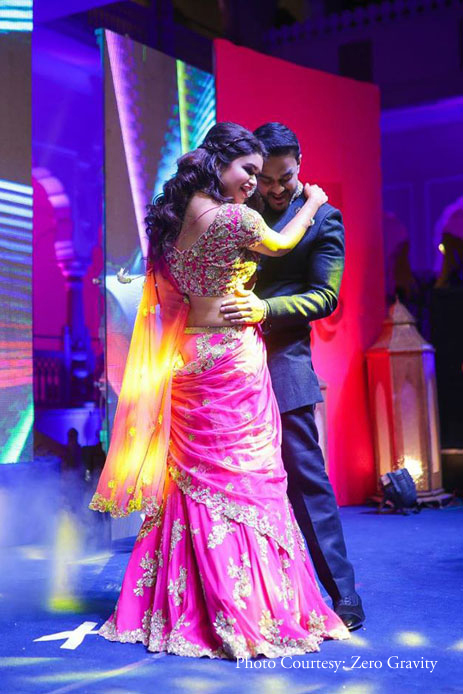 For the sangeet, Shreya and Rahul chose white roses and pink and purple lights to decorate the courtyard of the palace, keeping the venue looking ethereal and elegant. The backdrop designed for the dance stage made use of colored LED lights, adding pizzazz to the performances. Shreya wore a gorgeous embroidered lehenga by Malasa in hot pink, while Rahul donned an embroidered black achkan by Shyamal and Bhumika.