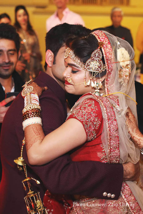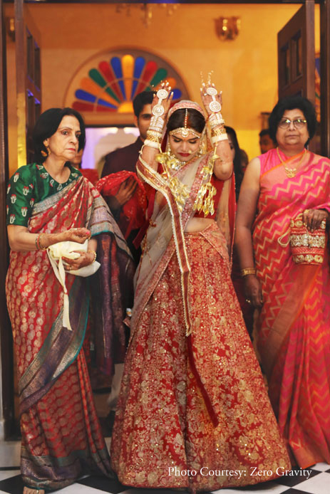 Shreya looked mesmerizing in a bright red lehenga with a gold and champagne-hued dupatta by Shyamal and Bhumika. She paired her outfit with a kundan haathphool. The groom complemented her in an embroidered sherwani by Carma India. The happy bride says, “There is a growing trend of pastel bridal wear, but there’s something about the classic red lehenga that is so charming – that will never fade.” She ditched the usual choice of sky-high stilettos, opting for comfortable wedges with embroidery instead.