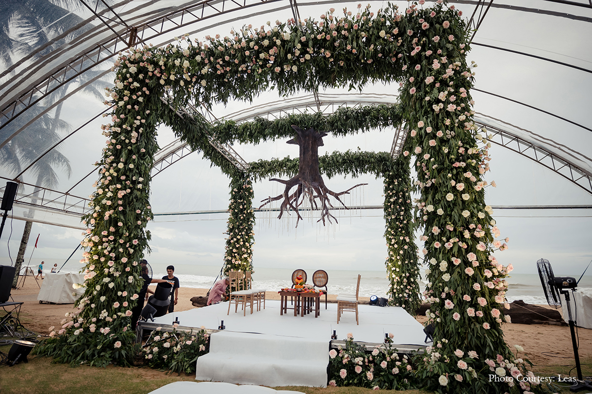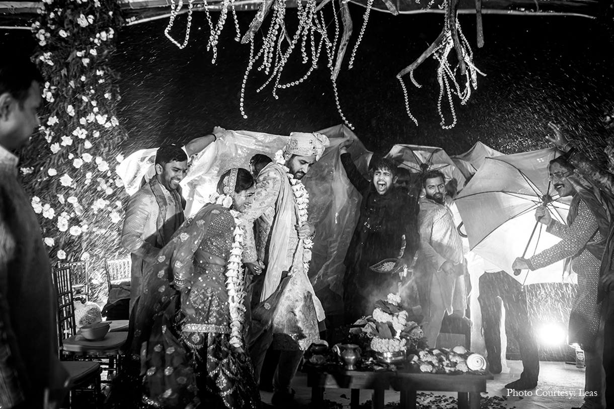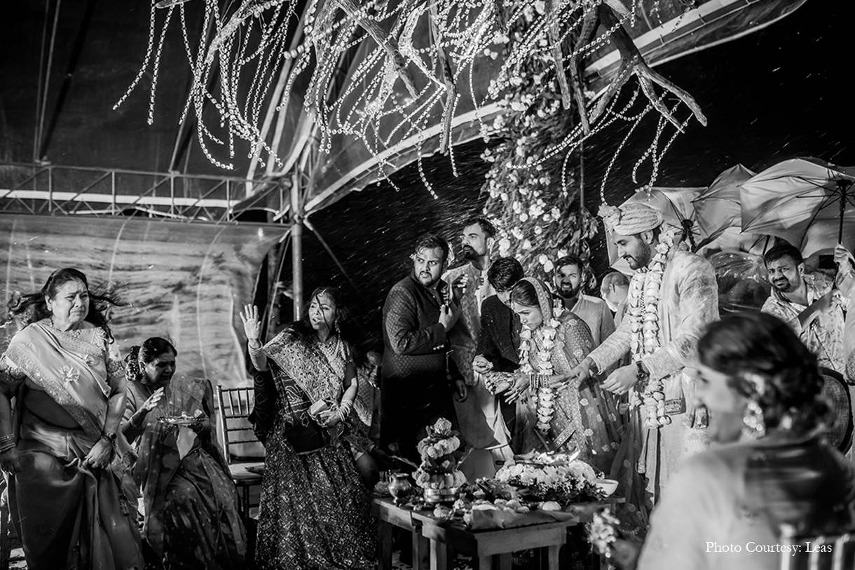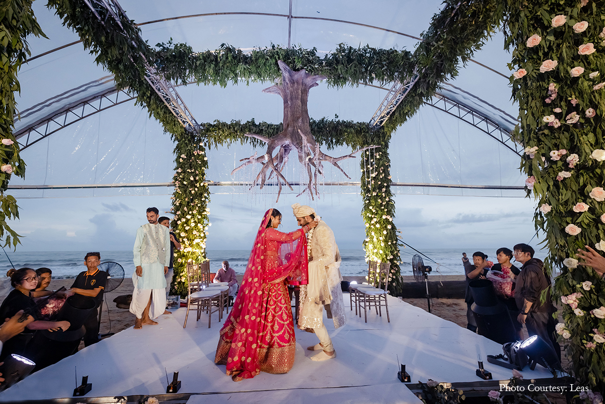 Hosted on the beach in the midst of a thunderstorm, the wedding was as spectacular as it was emotional. The groom’s entry on his vintage car set things off, complete with a ‘Bar on the Wheels’ to delight his baraati, while the bride brought everyone to tears with her beautiful entry with her parents. The soft decor palette of white and green set a serene ambiance for the sunset wedding, the highlight of which was the stunning ‘Tree of Life’ mandap. The couple exchanged vows to the musical sound of raindrops falling on the clear dome above their heads, making for a truly special memory.