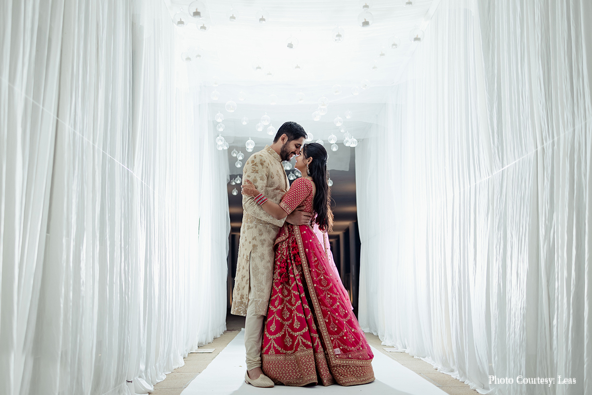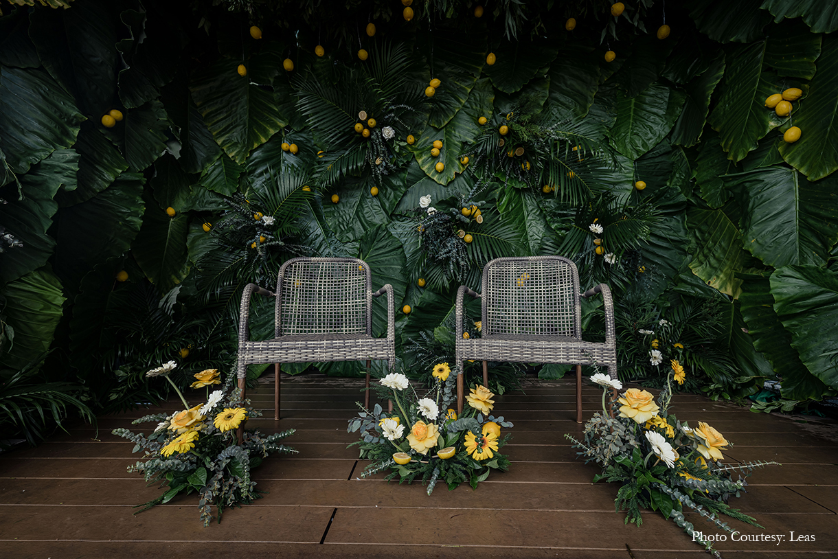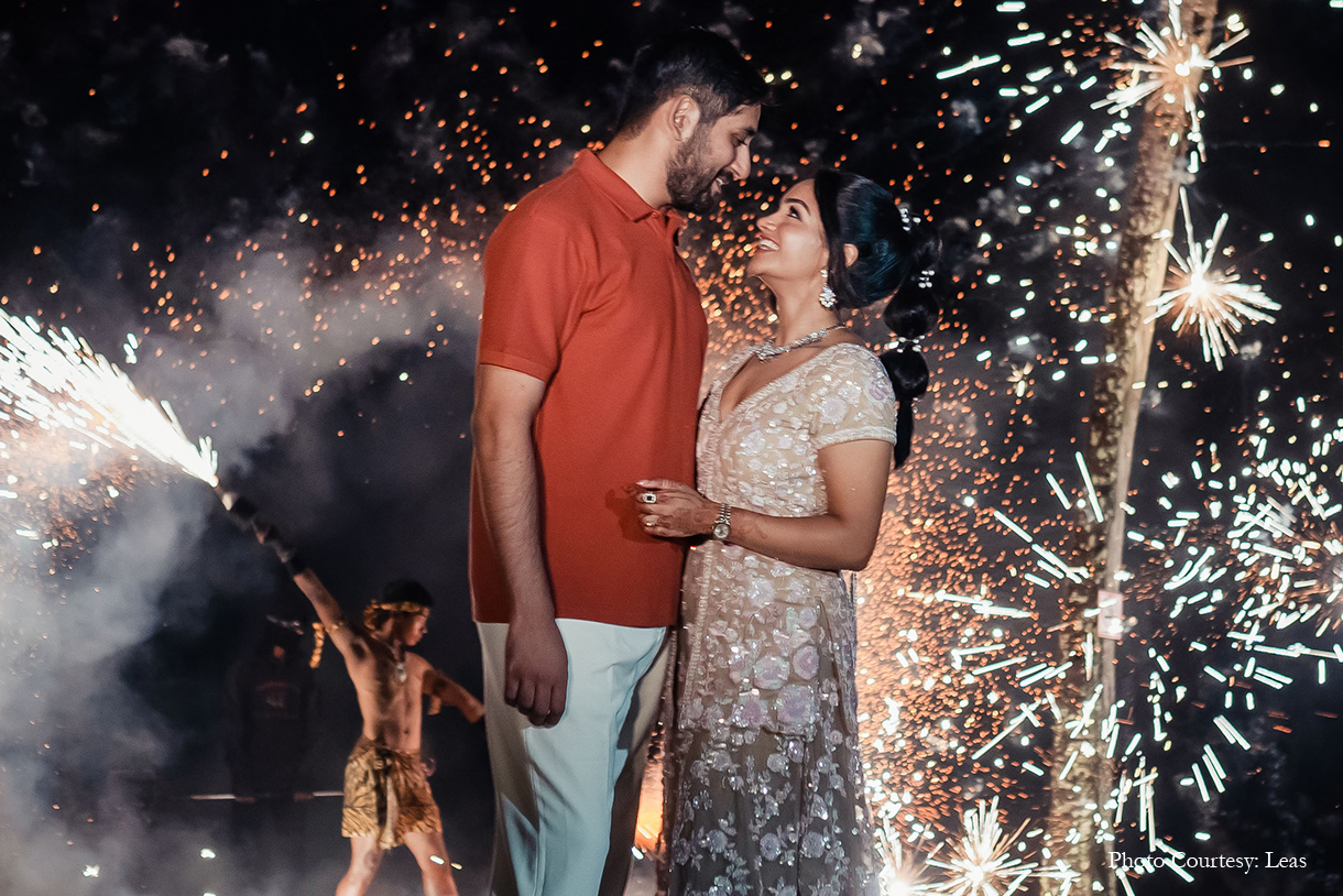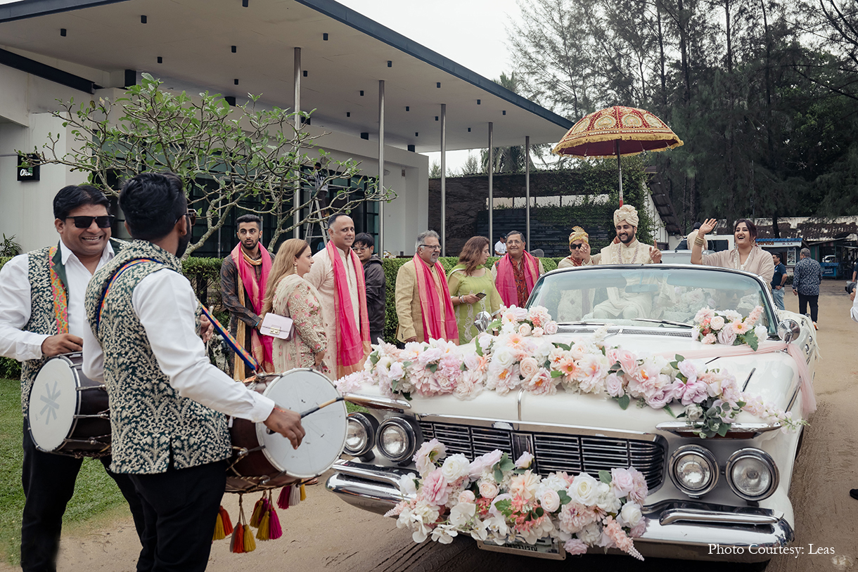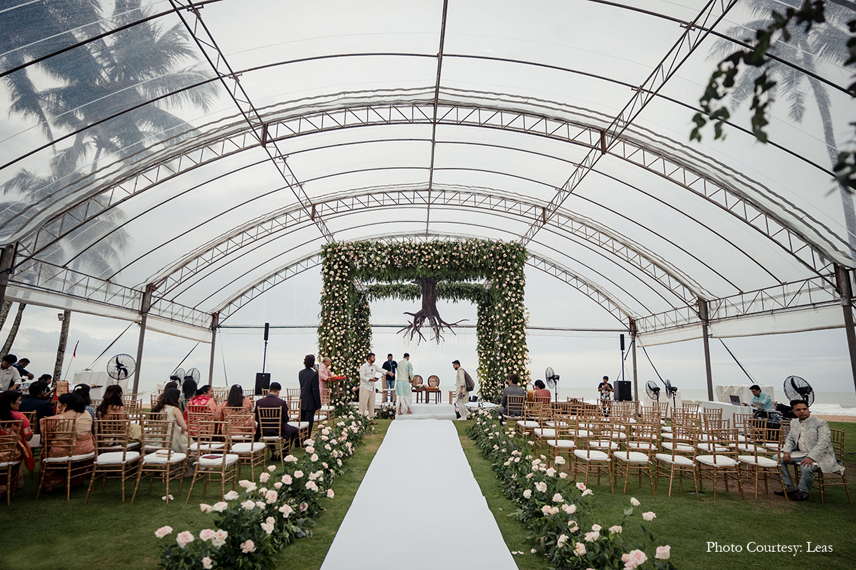 Hosted on the beach in the midst of a thunderstorm, the wedding was as spectacular as it was emotional. The groom’s entry on his vintage car set things off, complete with a ‘Bar on the Wheels’ to delight his baraati, while the bride brought everyone to tears with her beautiful entry with her parents. The soft decor palette of white and green set a serene ambiance for the sunset wedding, the highlight of which was the stunning ‘Tree of Life’ mandap. The couple exchanged vows to the musical sound of raindrops falling on the clear dome above their heads, making for a truly special memory.