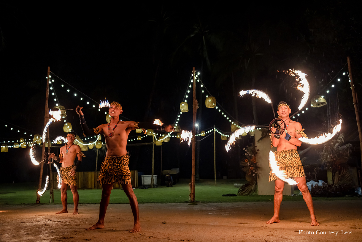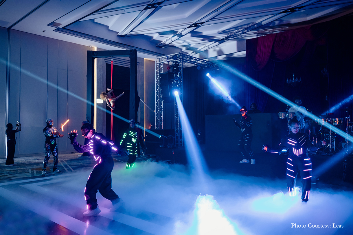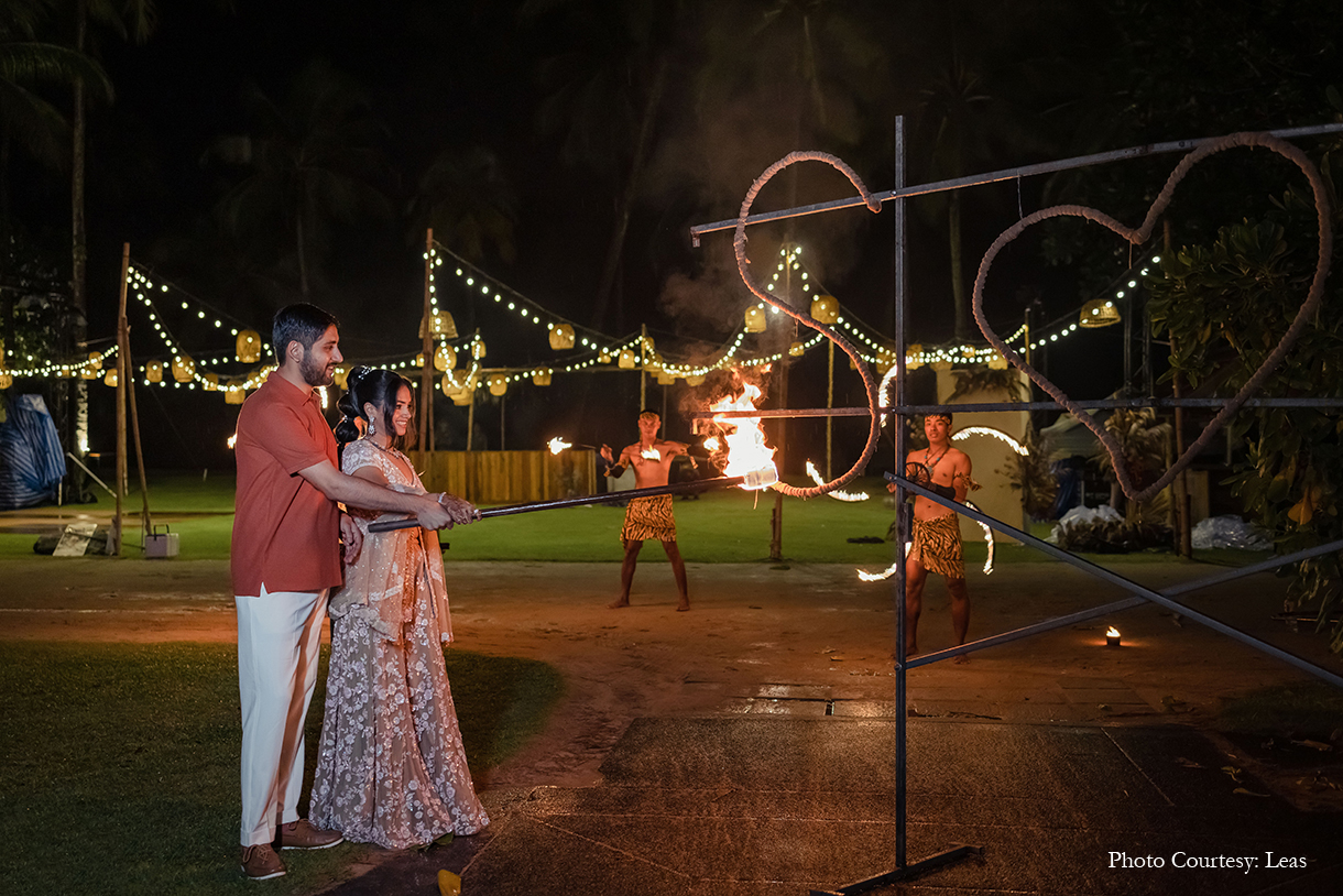 The festivities set off on a high with a sundowner event, where the couple welcomed their guests with a spectacle of fire! Fire dancers and bamboo dancers awed everyone with their skills, and fun games of limbo, etc. got everyone to mingle and have a blast. What took the cake however was the massive rope logo that was lit by the couple much to everyone’s amazement. The couple also shared heartfelt speeches that added a lovely personal touch to the occasion.
