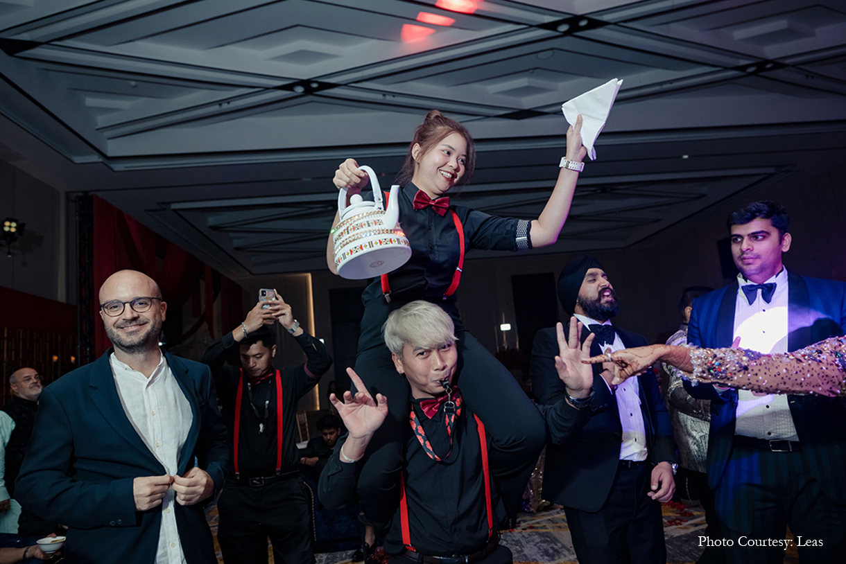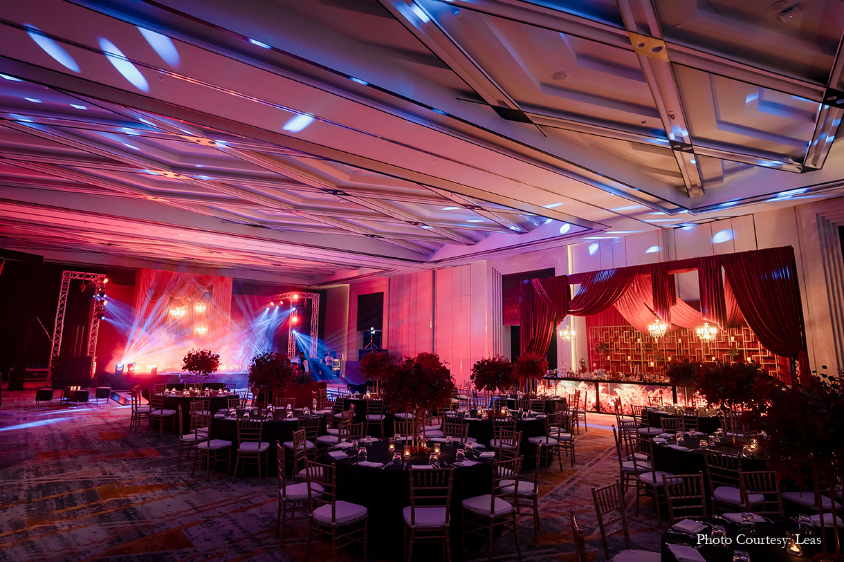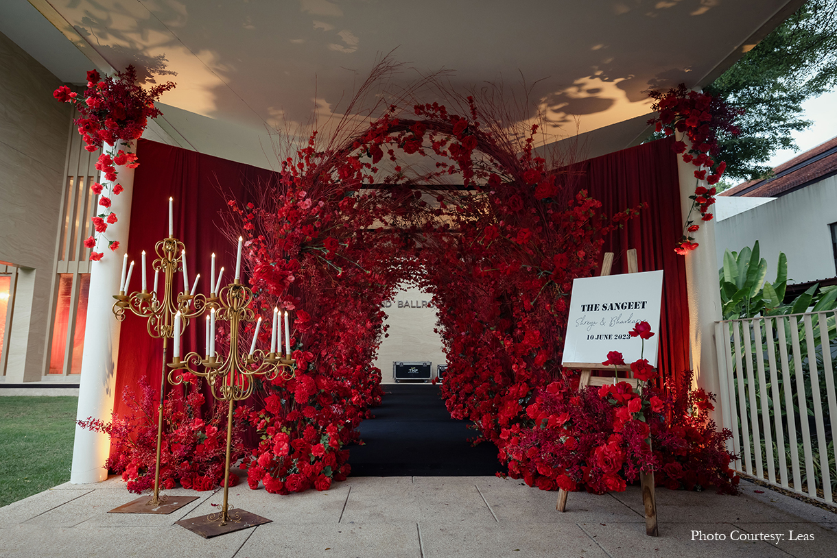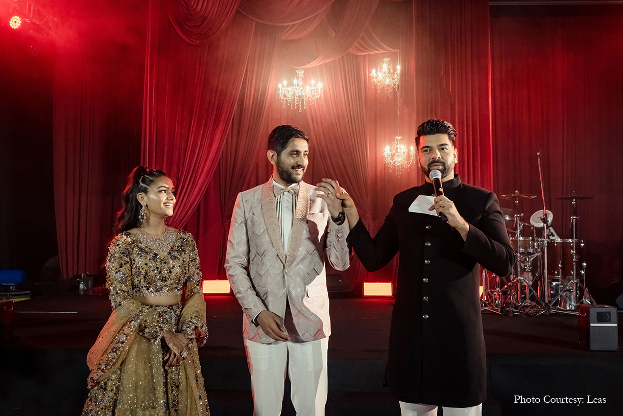 A profusion of red blooms greeted the guests at the entrance as they stepped into the Sangeet evening, a paradise of red and gold brimming with tropical luxury. A troupe of LED dancers accompanied the couple into the occasion and continued to delight the guests, while aerial artists handed out champagne for a truly wow experience. Emcee Vipul Roy had everyone in high spirits as they witnessed the beautiful ring exchange, and enjoyed a night of music and dancing.