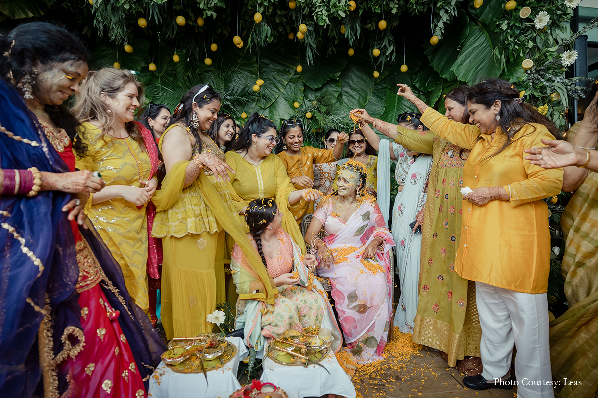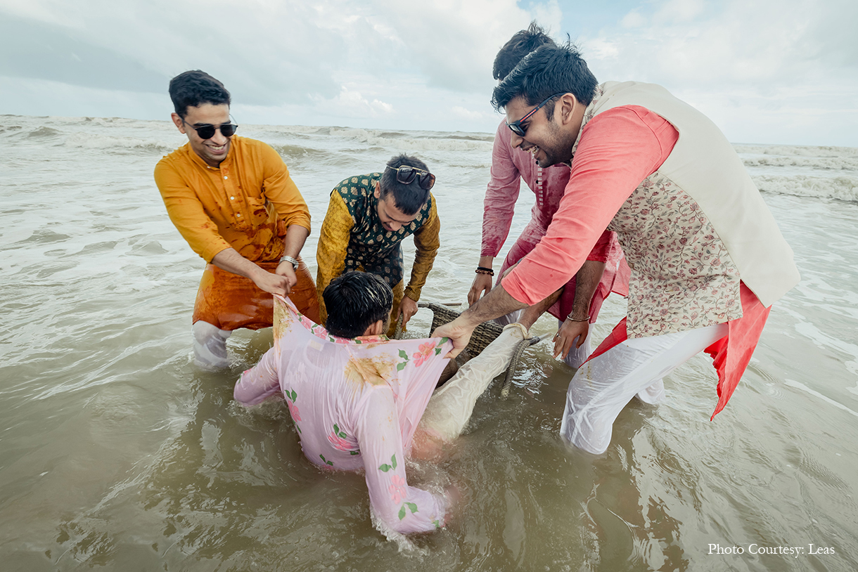 Hosted by the beach, the lively haldi function was bedecked with tropical exuberance. A backdrop of lush green foliage with pops of lemon and yellow flowers set a charming tone for the festivities, while the bride and groom were soaked in haldi and water amidst peals of laughter and delight from their loved ones.