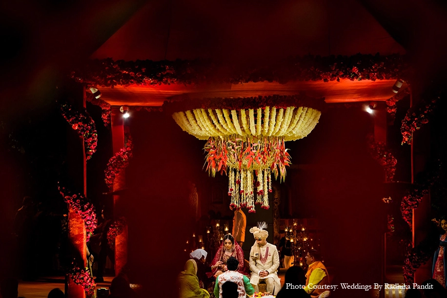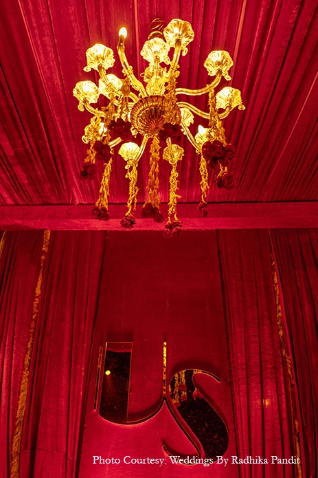Zashank shares, “The big day was planned with extreme grandeur. The couple wanted the classic mix of traditional glamour with dashes of contemporary tones. Knowing this, we used a red and gold color palette, white blooms and brass diya stands that complemented each other.”