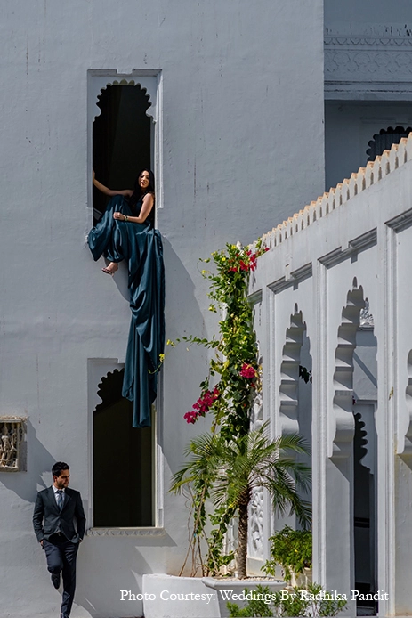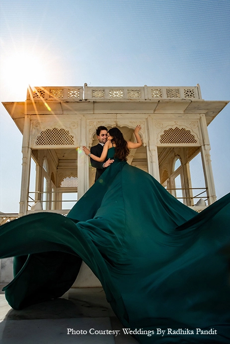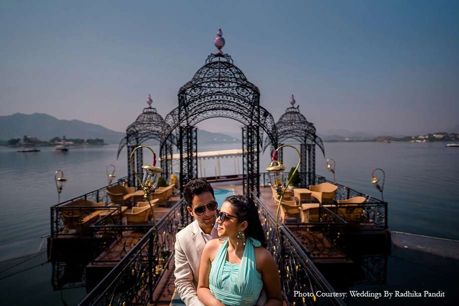 For his surprise wedding proposal, Udit whisked Shrishti away to Udaipur, a city she’s never visited before, on the pretence of a pre-wedding photoshoot at Taj Lake Palace, Udaipur. And, as they were clicking pictures, Udit swiftly went down on one knee to pop the question in front of her entire family.