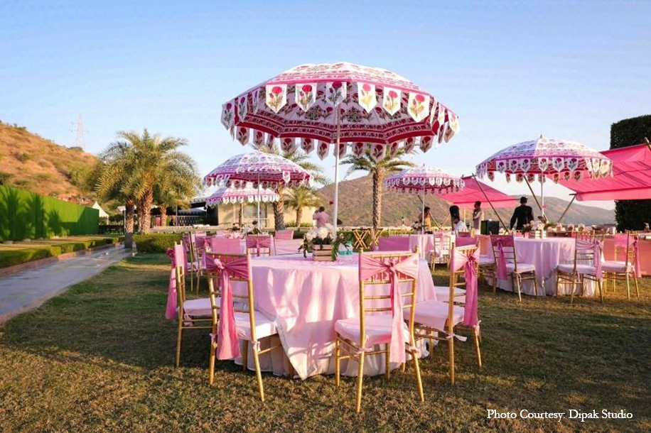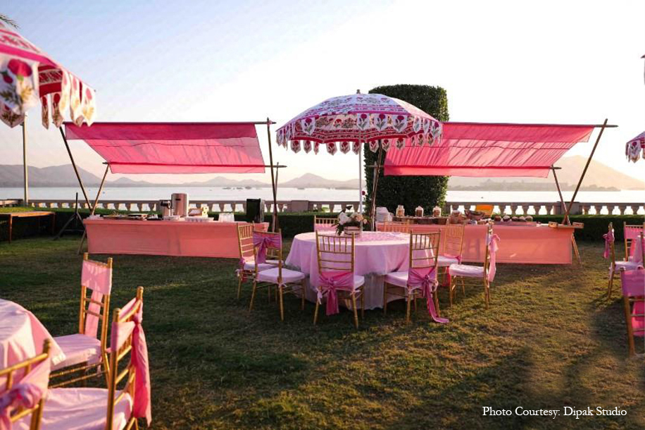 To welcome the couple and their guests to what was the beginning of a spectacular destination getaway, a stunning lakeside breakfast bash was hosted. Imagined in a pretty pink palette, everything from the table linen and cutlery to umbrellas, flowers, upholstery, and more featured floral and traditional motifs. Striking floral setups added a serene, romantic air to the morning, as everyone relished delicious eats by the shimmering waters.