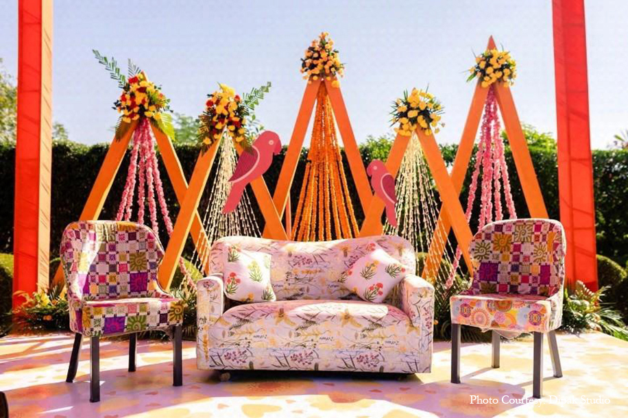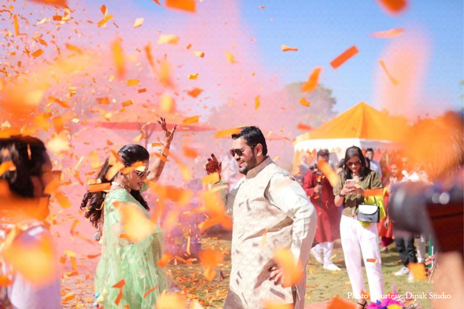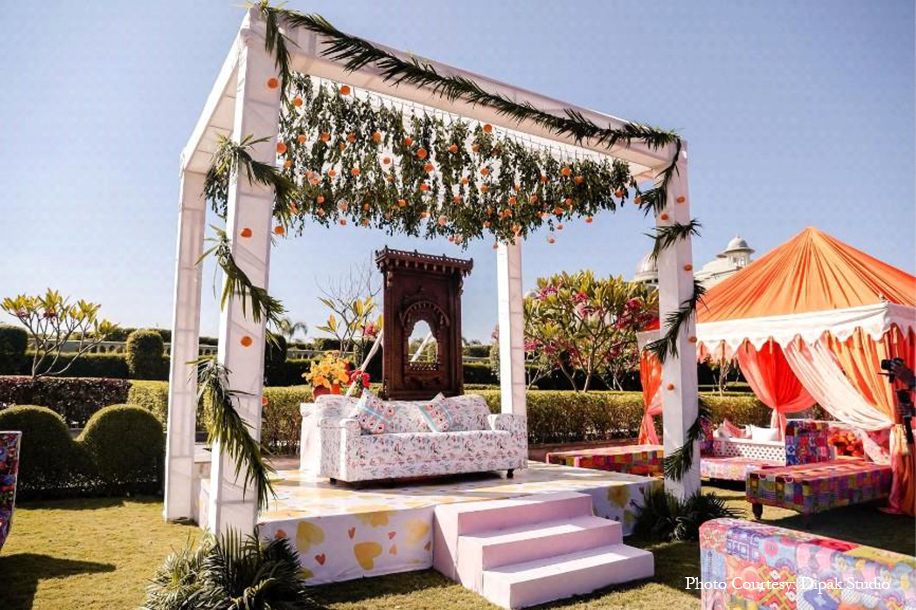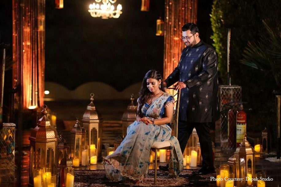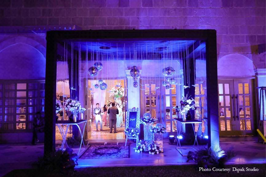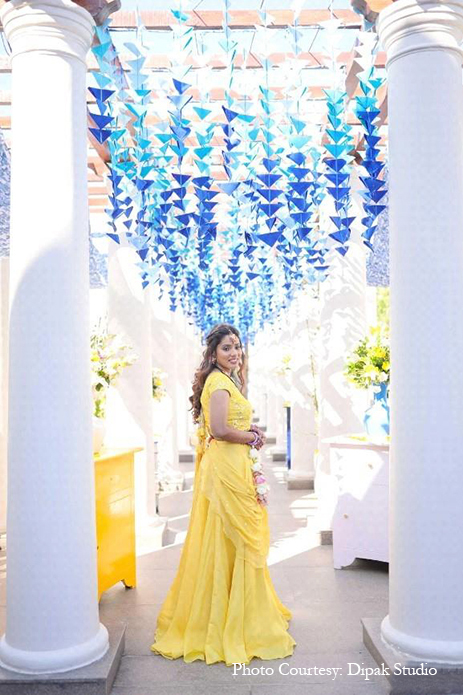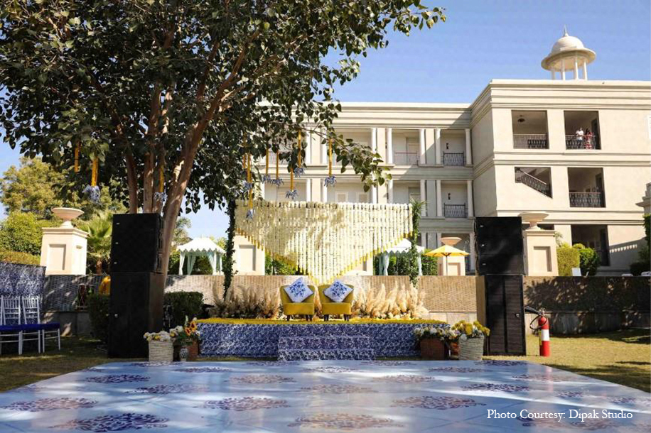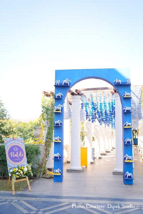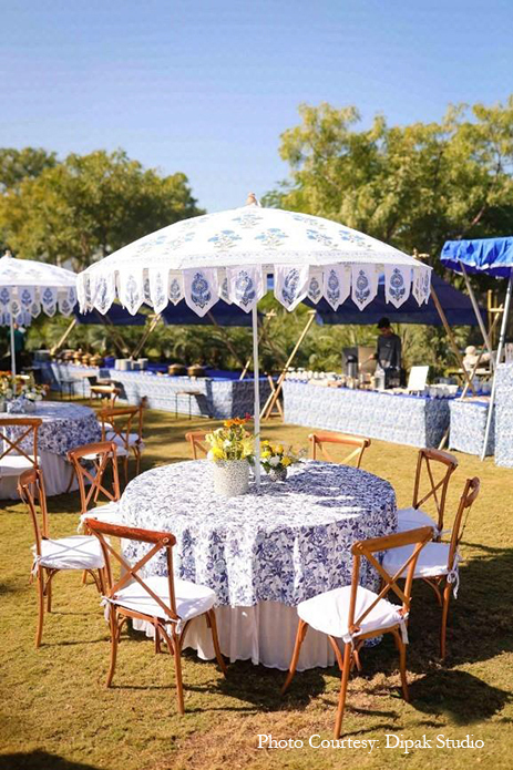 The vibrant yellow customary to the haldi ceremony was woven with touches of white and blue for a truly breathtaking celebration. Right from the unique ombre-toned canopy in the entry tunnel to the stand umbrellas, drapes, upholstery, dance, floor, pottery, and local crafts, the stunning blue color enveloped the occasion with traditional Rajasthani flavor while still keeping the vibe modern and minimalistic.