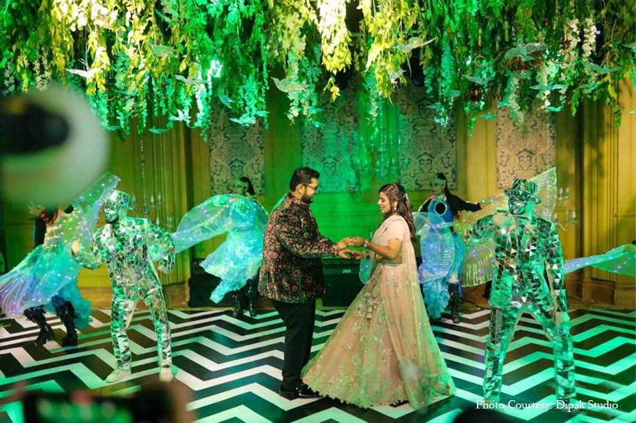 The rousing Sangeet night was the perfect blend of edgy and elegant, imagined with bold light installations, prints, and more. A palette of black and white for the floor and furniture set a striking tone, while colorful string lights, chandeliers, disco balls, and flowers added tons of sparkle and shine. A canopy of lush foliage, flowers, disco balls, and shimmering silver birds hung above the dance floor, adding an extra dose of magic to the stellar performances.