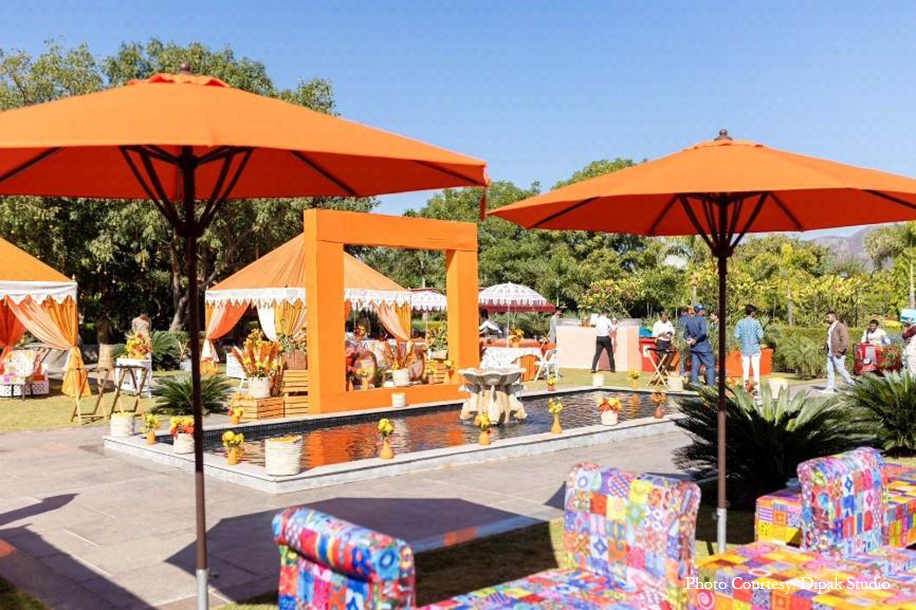 The lively hues of orange took over the lush lawns for the traditional Mayra celebrations. The exuberance of the citrus tone was contrasted with vibrant patterns and prints, fresh flowers, and the terracotta centerpiece to fill the morning with energy and enjoyment. The air was filled with confetti as everyone enjoyed music and dance.