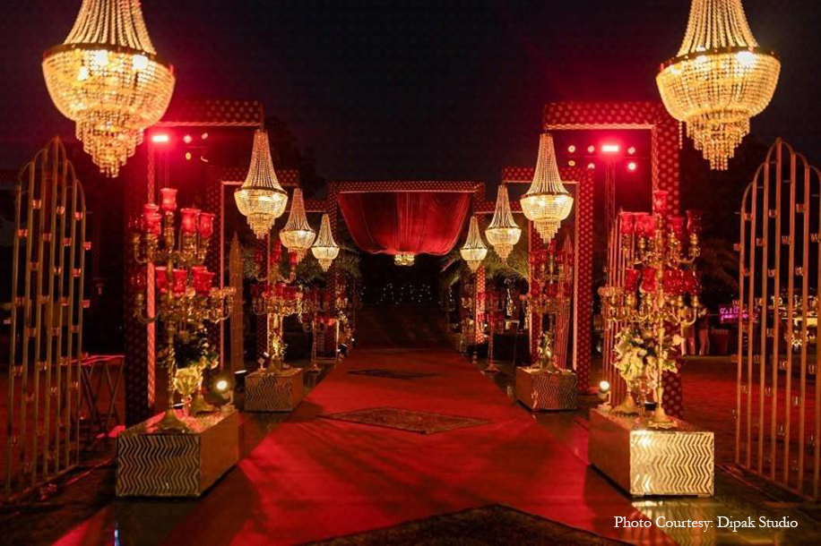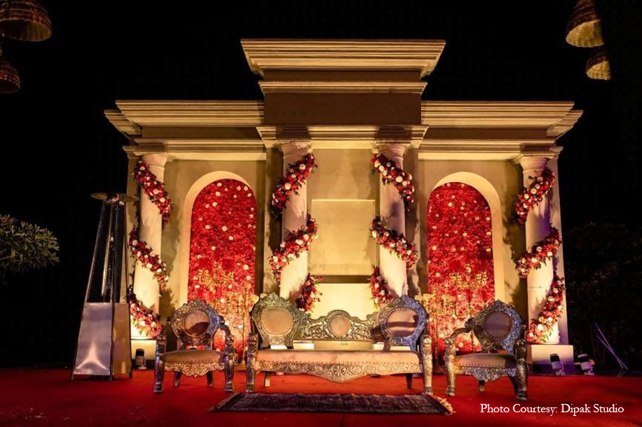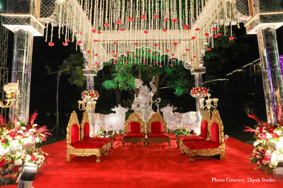 Brimming with grandeur, the royal wedding ceremony took place in the property’s stunning gardens, with a beautiful arbor serving as a focal point. Classic tones of red and gold infused the decor with richness, while the mandap with gorgeous floral hangings and a breathtaking view set an unbeatable ambiance for the auspicious occasion. The couple exchanged varmalas in a magnificent ritual flanked by a regal entourage, before taking their vows.