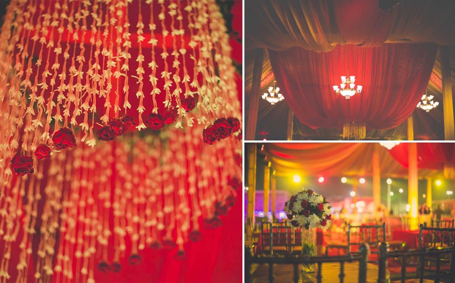For the wedding, we chose a red and gold theme with the added glamour of antique chandeliers to complement the mirrors, candles and white flowers.