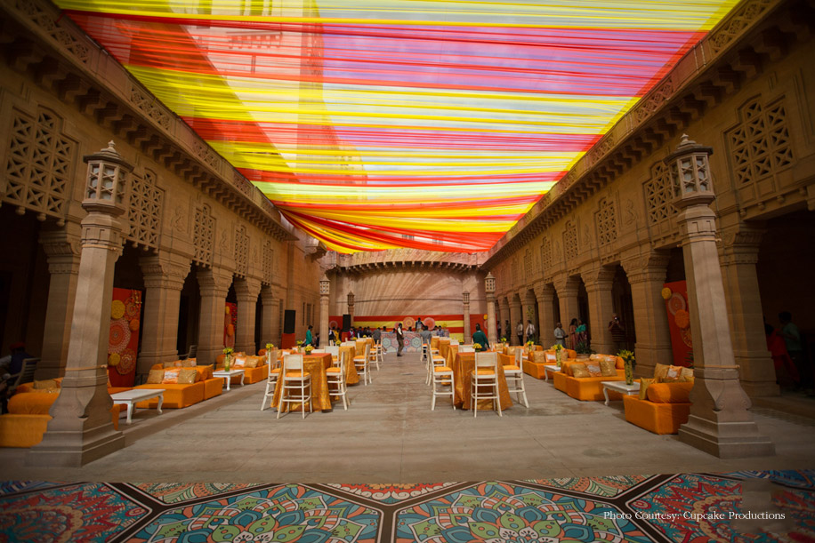 The sangeet was the grandest pre-wedding ceremony amongst all the celebrations hosted in honor of the happy couple. The stage for the function was erected on the lush lawns of the palace with colorful neon flashes and hundreds of tiny lights and lanterns brightening up the place. The tables were surrounded by crystal clear Chiavari chairs and elaborate floral centerpieces. The couple looked stunning together, and their guests cheered for them heartily. The other exciting highlights of this musical event were entertaining performances by Jay Sean and Juggy D, alongside the presence of TV star Mandira Bedi.