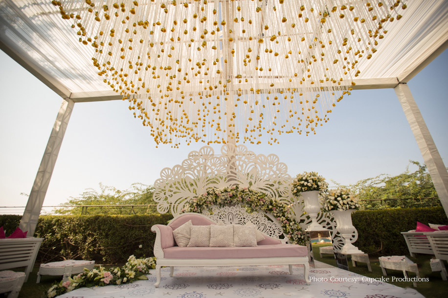 Pristine whites enamored the guests at Rohit and Shruti’s mehndi ceremony. The canopy set up around the stage included a white cut out background, pastel flowers and a pale powder pink sofa with white tuberose and yellow rose streamers extending from the roof. The couple wore complementing light powder blue outfits which offered a stunning contrast to the sturdy and rustic backdrop of the Umaid Bhawan Palace. The white tent set up for the lunch area also included a classy and contemporary touch to the chairs along with white floral arrangements. The highlight of the soiree was singer Hardy Sandhu’s thrilling live performance.