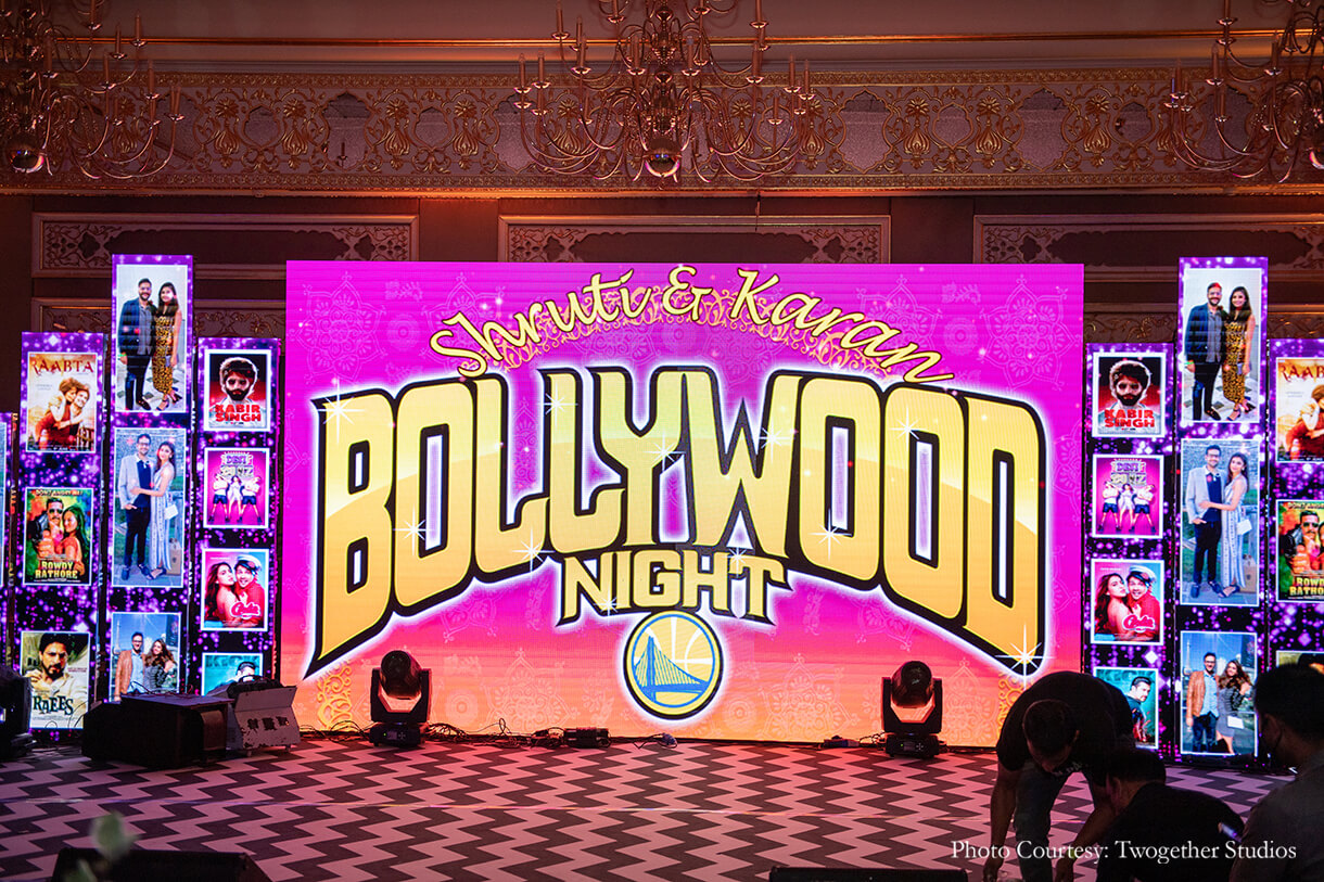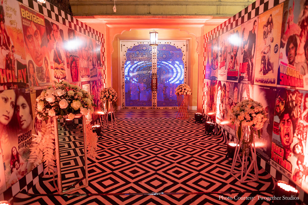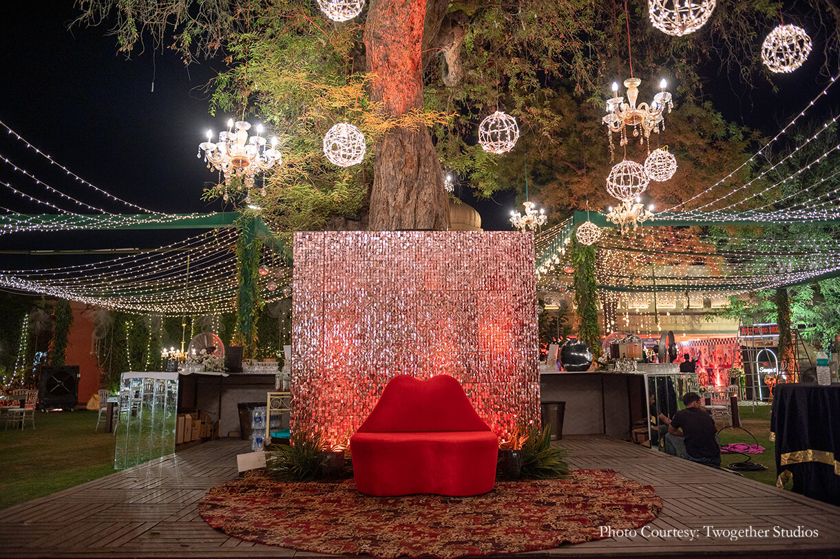 With the bride being a Bollywood buff, the sangeet party was orchestrated around a Bollywood theme with customized clapboards and LED signs that lit up the outdoor venue. Lanterns crafted out of fairy lights were suspended from a rustic canopy while a sequined backdrop made for a glam backdrop where everyone gathered to take selfies and official portraits.